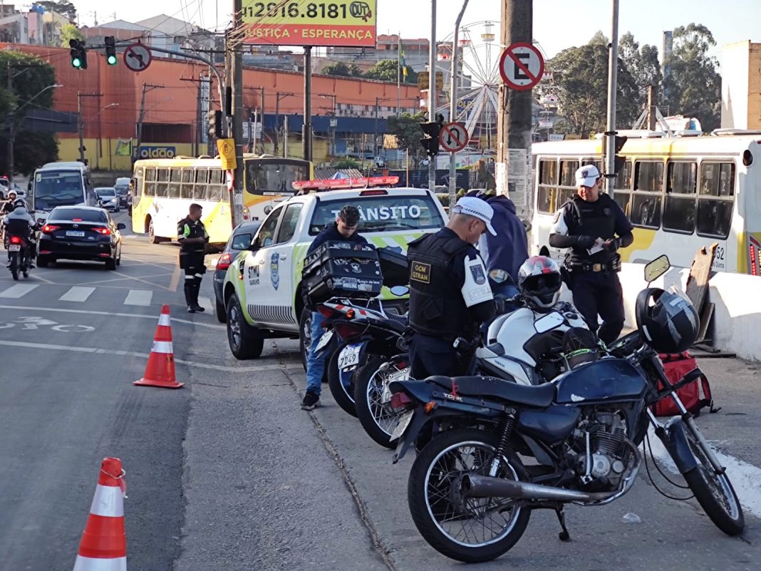 A Prefeitura de Guarulhos promoveu nesta quinta-feira (7), nas avenidas Juscelino Kubitschek de Oliveira e Faria Lima, duas das vias de maior movimento da cidade, a primeira edição da Operação Moto Segura. As abordagens, com ênfase na fiscalização de motocicletas, foram realizadas por agentes de transportes e trânsito da Secretaria de Transportes e Mobilidade Urbana, com o apoio Grupamento de Trânsito da Guarda Civil Municipal (Gtran).