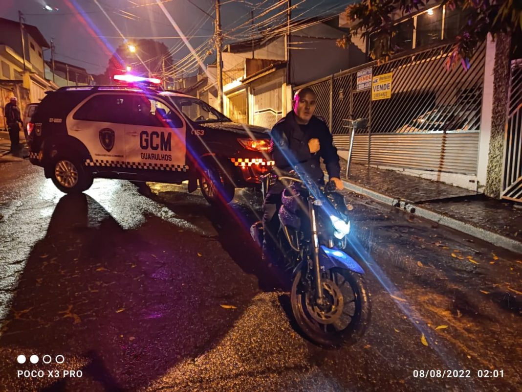 A Guarda Civil Municipal (GCM) recuperou na madrugada desta segunda-feira (8), durante um patrulhamento tático no Picanço, uma motocicleta Yamaha que havia sido roubada em julho na região do Pimentas. Um homem pilotava o veículo quando avistou a viatura e tentou fugir, mas foi interceptado para averiguação.