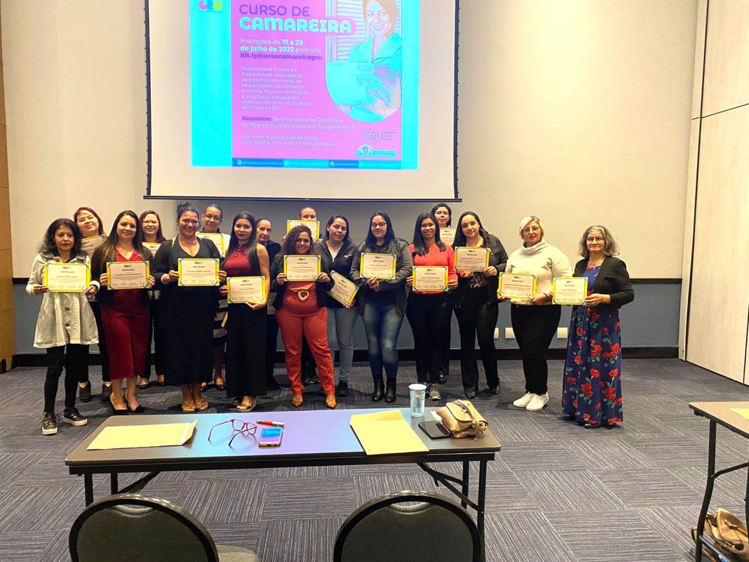 Na manhã desta quinta-feira (15) foi realizada a formatura de 17 mulheres no curso de camareira, oferecido gratuitamente pela Prefeitura de Guarulhos em parceria com o hotel Marriott. Foram 11 encontros de três horas em que foram abordados temas como apresentação pessoal, setores de um hotel, noções de hospitalidade, técnicas de limpeza, enxoval, entre outros.