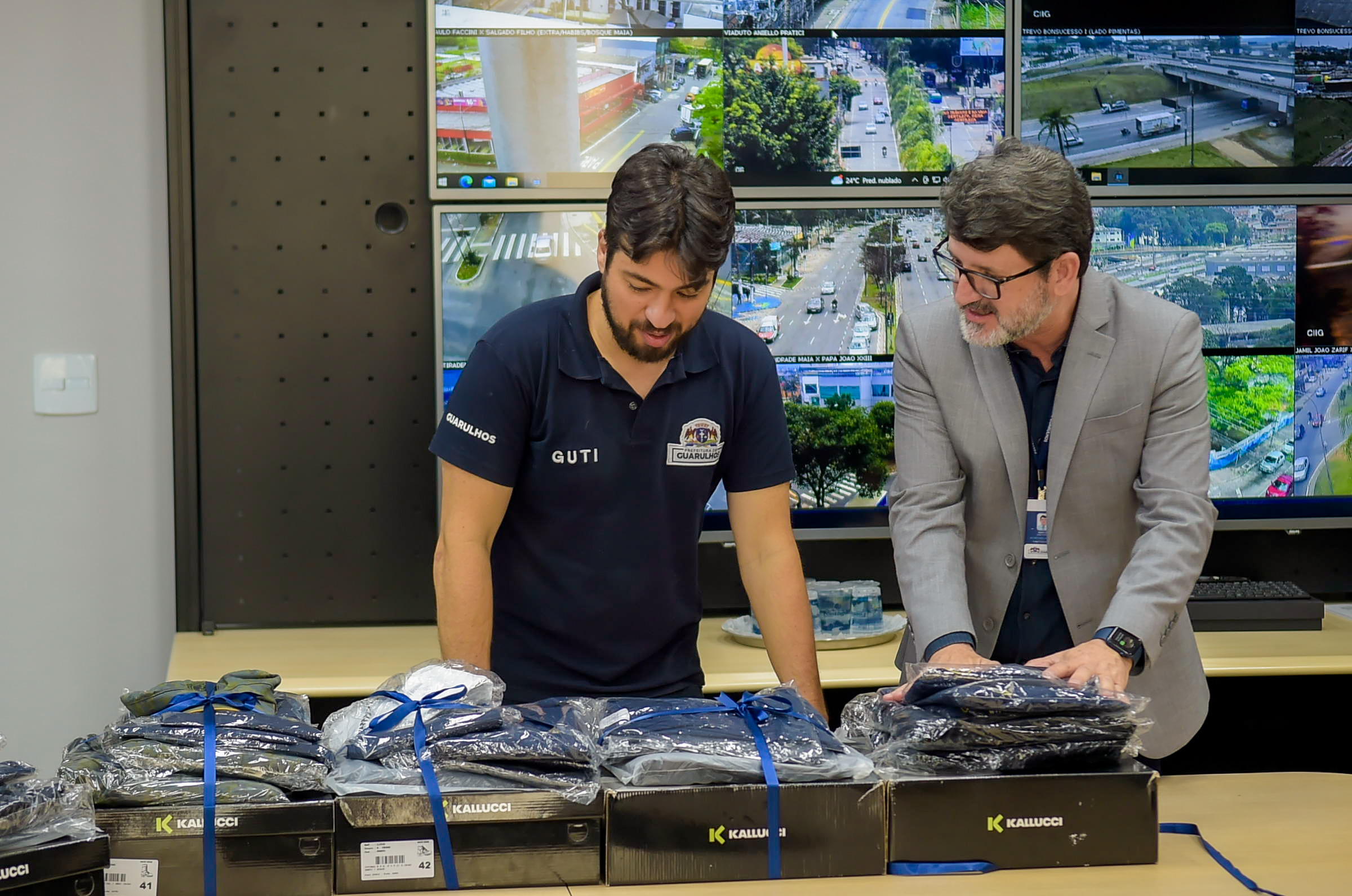 A Guarda Civil Municipal (GCM) de Guarulhos iniciou a entrega de novos uniformes ao efetivo de 726 agentes nesta quinta-feira (13), no Paço Municipal, em uma reunião com o prefeito Guti e autoridades da GCM. Ao todo são nove mil peças distribuídas em kits com camisas, calças, coturnos, bonés, cintos e camisetas com materiais reforçados para garantir durabilidade, conforto e mobilidade aos guardas.