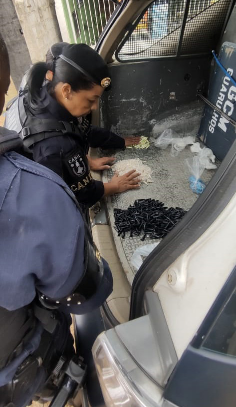 Mais de mil embalagens com cocaína, crack e maconha foram apreendidas em uma ação conjunta da Guarda Civil Municipal (GCM) de Guarulhos e da Polícia Militar na sexta-feira (4) no bairro Água Azul. Com a ajuda de dois cães policiais da GCM, os pastores-belga-malionois Ventania e Hatch, os agentes adentraram a mata fechada e encontraram os entorpecentes rapidamente. Dois suspeitos foram avistados na área, mas fugiram.