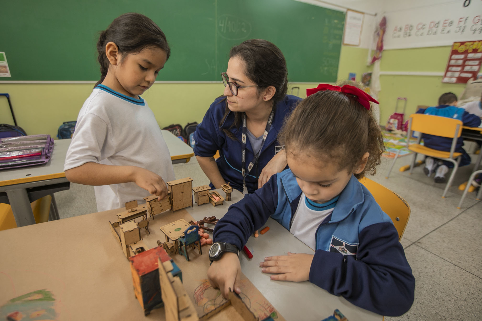 A sala referência do estágio II foi organizada intencionalmente para que as crianças possam registrar as aprendizagens. “A partir do interesse das crianças surgiram cantos fixos para escrita, leitura e pesquisa. Os grupos fazem um rodízio e, em cada canto, registram suas investigações e descobertas em um diário de bordo”, explicou a professora Juliana Morgado sobre a ocupação desses espaços.