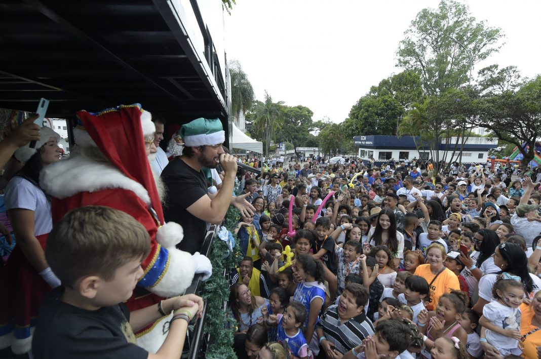 Mais de 2,3 mil crianças se reuniram no Paço Municipal nesta sexta-feira (16) para celebrar o Natal Solidário 2022, evento realizado pela Prefeitura de Guarulhos por meio do Fundo Social de Solidariedade. Pequenos de 35 ONGs de todas as regiões da cidade aproveitaram uma tarde de muito calor com sorvete, cachorro-quente, hambúrguer, pipoca e algodão-doce. Eles também puderam brincar nos diversos brinquedos infláveis, além de usufruírem de pintura facial, gincanas, balões e palhaços que fizeram a alegria do evento junto do Papai Noel, que chegou em um helicóptero.