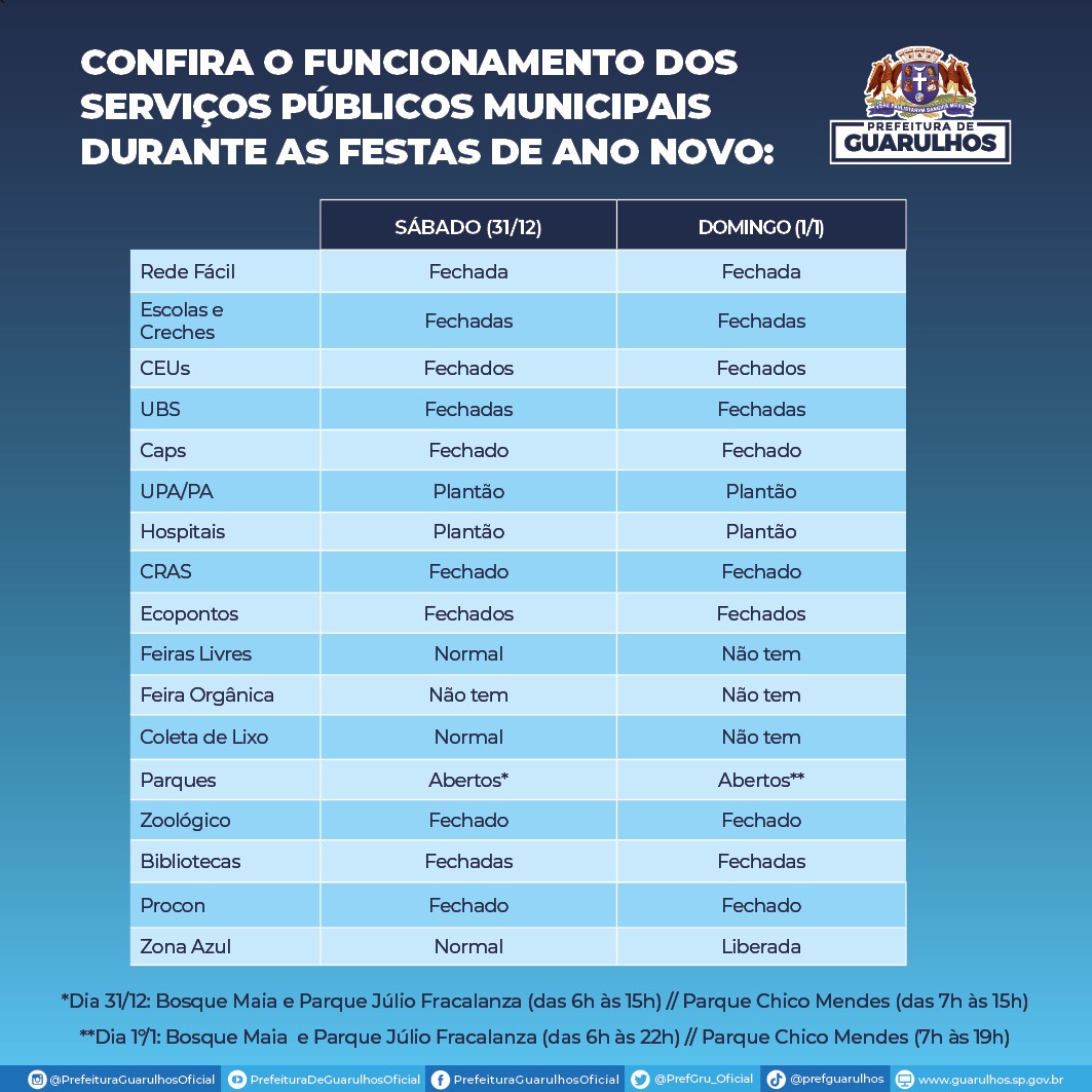 Funcionamento dos serviços públicos no feriado de Ano Novo em Guarulhos dezembro 28, 2022 Atualizado: dezembro 28, 2022 Compartilhar WhatsAppFacebookXLinkedin Compartilhar WhatsAppFacebookXLinkedin Em alta Cidade Feriado de Tiradentes aumenta fluxo de passageiros em aeroportos abril 17, 2026 Destaque GCM intensifica combate ao tráfico e apreende drogas em operação abril 17, 2026 Esporte Copa Mundial de Futebol Unificado: Brasil cai no grupo dos anfitriões franceses abril 17, 2026 Colunas Supercarregadeira para terrenos inclinados é apresentada em Pernambuco abril 17, 2026 Notícias relacionadas Cidade Feriado de Tiradentes aumenta fluxo de passageiros em aeroportos abril 17, 2026 Destaque GCM intensifica combate ao tráfico e apreende drogas em operação abril 17, 2026 Esporte Copa Mundial de Futebol Unificado: Brasil cai no grupo dos anfitriões franceses abril 17, 2026 Colunas Supercarregadeira para terrenos inclinados é apresentada em Pernambuco abril 17, 2026