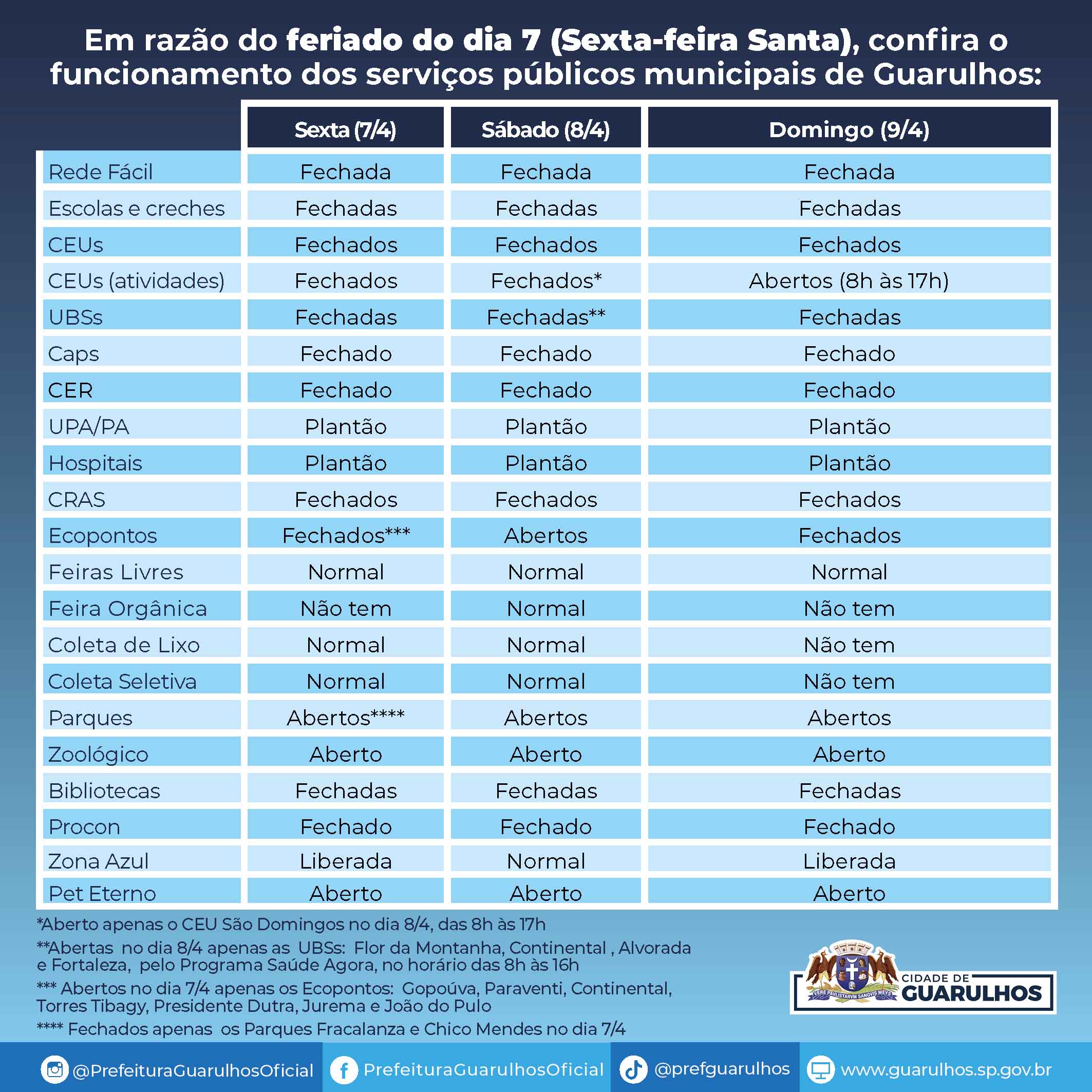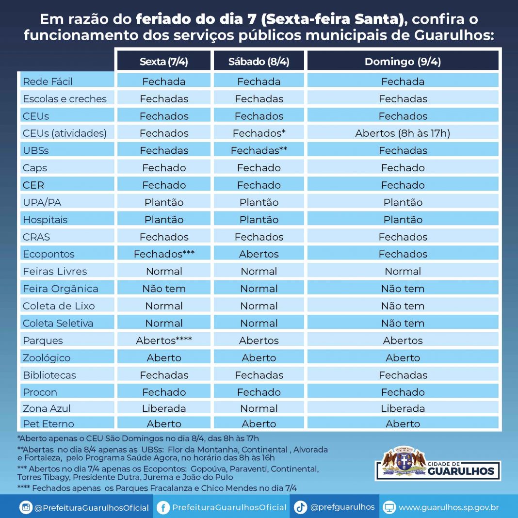 A Prefeitura de Guarulhos informa que, à exceção dos serviços municipais essenciais, os demais não funcionarão nesta Sexta-Feira Santa (7). Já no sábado (8) haverá a abertura de quatro UBS pelo programa Saúde Agora: Flor da Montanha, Continental, Alvorada e Fortaleza.