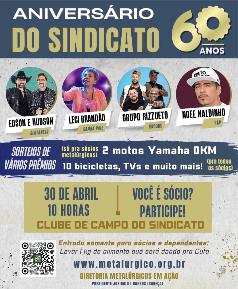 Domingo, 30, o Sindicato dos Metalúrgicos de Guarulhos e Região fará 60 anos. Data será comemorada no Clube de Campo, com festa, música e sorteios de prêmios.