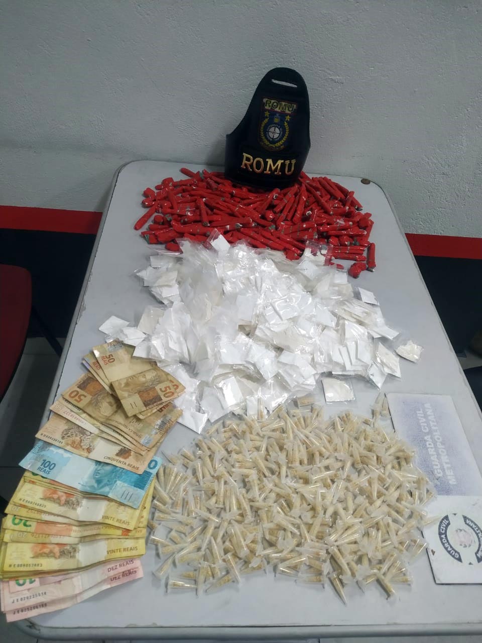 A Guarda Civil Municipal (GCM) de Guarulhos prendeu um homem com 1.121 porções de drogas na noite de sábado (13) na praça Orobó, Jardim São João. A equipe efetuava patrulhamento preventivo na região quando percebeu o acusado, que tentou fugir e dispensar uma sacola com as substâncias em embalagens prontas para comercialização, além de 1.200 reais.