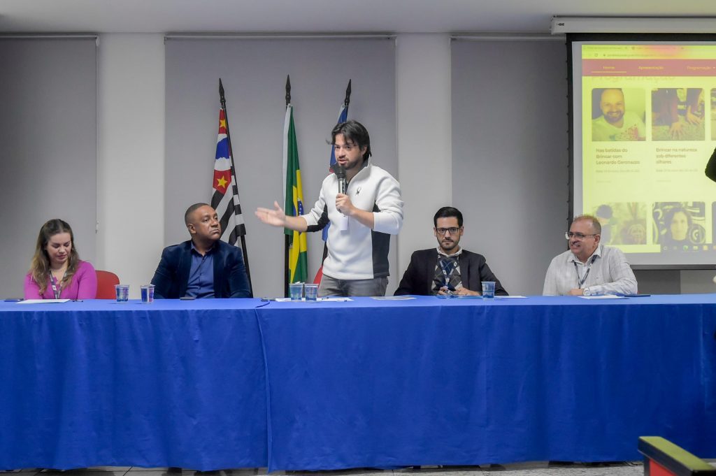 No encerramento do evento os convidados responderam a perguntas dos diretores da rede de ensino de Guarulhos e discutiram o papel de cada gestor em apoiar e aprofundar as experiências brincantes nos diferentes territórios e ambientes.