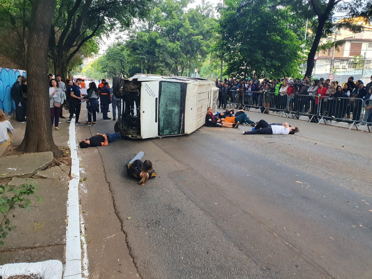 A Defesa Civil de Guarulhos participou neste domingo (21) de um treinamento que simulou o resgate de 28 vítimas pela colisão de um caminhão carregado de substância química contaminante e uma van na avenida Sumaré, na Capital. O 7º Simulado de Integração das Forças Públicas e Privadas da cidade de São Paulo foi organizado pelo Hospital Albert Einstein e envolveu grupos policiais, bombeiros e serviços de atendimento a emergências.