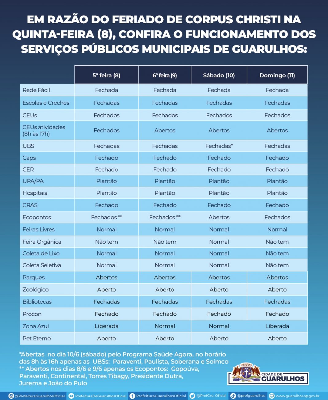 Funcionamento dos serviços públicos municipais nos feriado de Corpus Christi junho 6, 2023 Atualizado: junho 6, 2023 Compartilhar WhatsAppFacebookXLinkedin Em razão do feriado de Corpus Christi na quinta-feira (8), os serviços públicos municipais voltam somente à normalidade na próxima segunda-feira (12). Seguem, em anexo, as informações sobre os serviços e atendimento público nesse período. Compartilhar WhatsAppFacebookXLinkedin Em alta Cidade Guarulhos aprova lei que cria o Dia Municipal da Mobilização dos Homens pelo Fim da Violência contra as Mulheres abril 16, 2026 Cidade Encontro arteterapêutico de mulheres com fibromialgia é marcado por emoção e partilha abril 16, 2026 Cidade Guarulhos mobiliza forças de segurança e reúne cerca de 200 pessoas em ação de doação de sangue no 15º BPM abril 16, 2026 Colunas O desafio do saneamento no Brasil não é mais investimento: é execução abril 16, 2026 Notícias relacionadas Cidade Guarulhos aprova lei que cria o Dia Municipal da Mobilização dos Homens pelo Fim da Violência contra as Mulheres abril 16, 2026 Cidade Encontro arteterapêutico de mulheres com fibromialgia é marcado por emoção e partilha abril 16, 2026 Cidade Guarulhos mobiliza forças de segurança e reúne cerca de 200 pessoas em ação de doação de sangue no 15º BPM abril 16, 2026 Colunas O desafio do saneamento no Brasil não é mais investimento: é execução abril 16, 2026