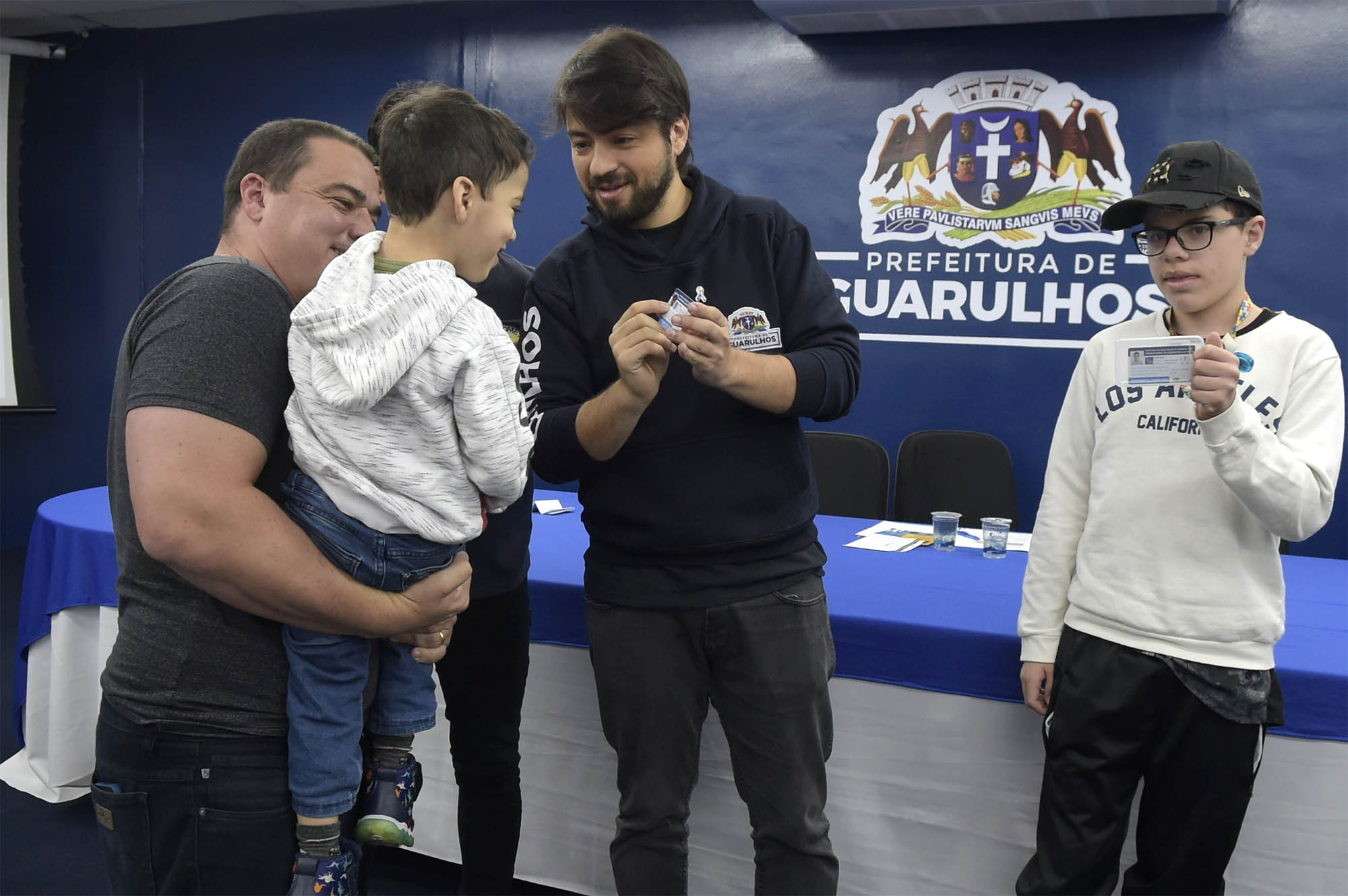 Em cerimônia realizada no auditório do Paço Municipal, o prefeito de Guarulhos, Guti, entregou nesta terça-feira (13) a milésima Carteira de Identificação de Pessoas com Transtorno do Espectro Autista (Ciptea) ao menino Enzo Ferreira, de três anos, que estava ao lado do jovem Leonardo Cezar Z. Caraça, de 11 anos, o primeiro a obter a carteira, em outubro do ano passado.