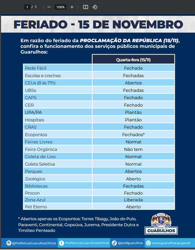 Funcionamento dos serviços públicos municipais no feriado da Proclamação da República novembro 14, 2023 Atualizado: novembro 14, 2023 Compartilhar WhatsAppFacebookTwitterLinkedin Em razão do feriado da Proclamação da República nesta quarta-feira (15), veja como irá funcionar os serviços públicos municipais de Guarulhos na tabela em anexo e abaixo. Compartilhar WhatsAppFacebookTwitterLinkedin Em alta Política Serviços públicos municipais terão funcionamento diferenciado no Carnaval em Guarulhos fevereiro 11, 2026 Política Isenção de IPVA para motos em São Paulo beneficia frota que cresceu 33% no estado em 10 anos fevereiro 11, 2026 Cidade Maior parte do país deve ter chuvas intensas hoje fevereiro 11, 2026 brasil Governo federal anuncia investimentos de R$ 4,6 bilhões em aeroportos fevereiro 11, 2026 Notícias relacionadas Política Serviços públicos municipais terão funcionamento diferenciado no Carnaval em Guarulhos fevereiro 11, 2026 Política Isenção de IPVA para motos em São Paulo beneficia frota que cresceu 33% no estado em 10 anos fevereiro 11, 2026 Cidade Maior parte do país deve ter chuvas intensas hoje fevereiro 11, 2026 brasil Governo federal anuncia investimentos de R$ 4,6 bilhões em aeroportos fevereiro 11, 2026