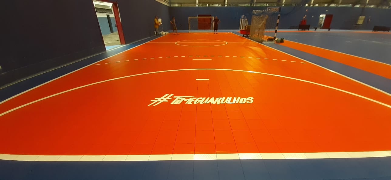Homologado pelas federações de futsal e handebol, o piso modular esportivo contempla uma quadra de dimensões oficiais. Além disso, foi implantada no espaço uma pequena quadra que servirá como recreação e aquecimento.