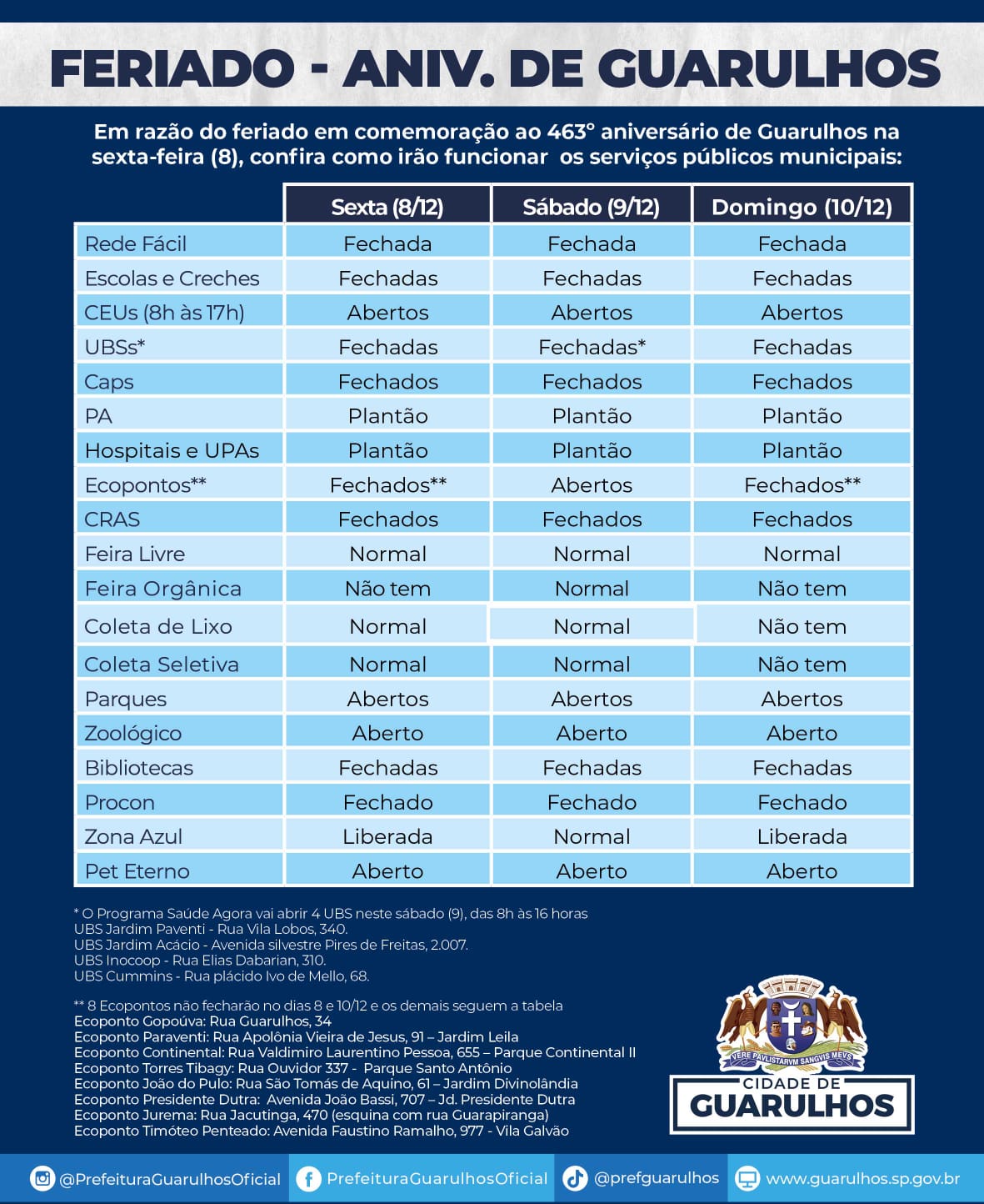 Prefeitura divulga como funcionarão os serviços municipais no feriado do aniversário de Guarulhos dezembro 5, 2023 Atualizado: dezembro 5, 2023 Compartilhar WhatsAppFacebookXLinkedin Em razão do feriado em comemoração ao 463º aniversário de Guarulhos nesta sexta-feira (8), confira, acima, como irão funcionar os serviços públicos municipais Compartilhar WhatsAppFacebookXLinkedin Em alta brasil Mortes causadas por PMs aumentaram 35% em todo o estado de São Paulo abril 1, 2026 Cidade Operação SP Sem Fogo 2026: Defesa Civil começa treinamentos para temporada de incêndios abril 1, 2026 Política Polícia de SP descobre fábrica que distribuía bebidas alcoólicas falsificadas a comerciantes no interior de SP abril 1, 2026 brasil Auxílio-alimentação de servidores públicos federais sobe para R$ 1.192 abril 1, 2026 Notícias relacionadas brasil Mortes causadas por PMs aumentaram 35% em todo o estado de São Paulo abril 1, 2026 Cidade Operação SP Sem Fogo 2026: Defesa Civil começa treinamentos para temporada de incêndios abril 1, 2026 Política Polícia de SP descobre fábrica que distribuía bebidas alcoólicas falsificadas a comerciantes no interior de SP abril 1, 2026 brasil Auxílio-alimentação de servidores públicos federais sobe para R$ 1.192 abril 1, 2026
