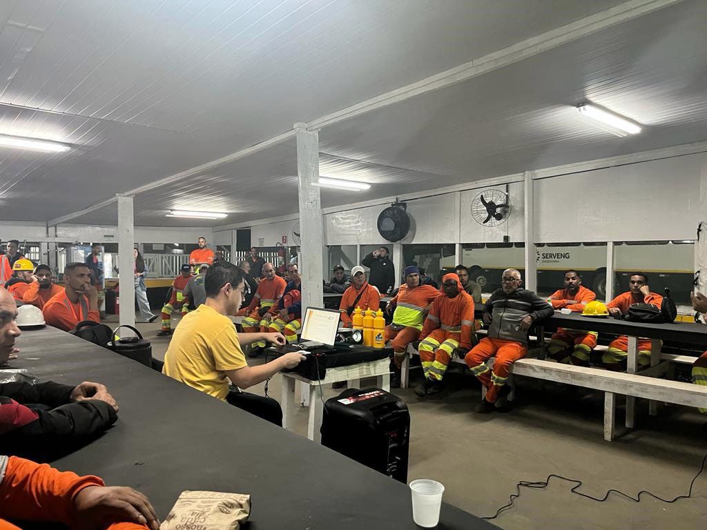 Já nos dias 12 e 13 a palestra foi conduzida pelos educadores Roberto Pardinho e Maria Luiza para 60 funcionários do Grupo Serveng no canteiro de obras da empresa localizado no Trevo de Bonsucesso.