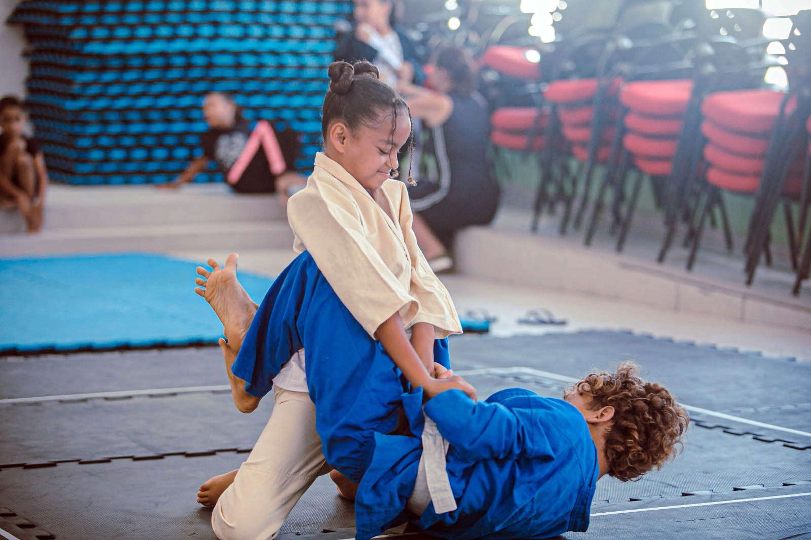 Sob os olhares atentos dos familiares, as crianças da EPG, localizada no bairro Mato das Cobras, realizaram dinâmicas como finalização, movimentos do samurai e de controle, joelho na barriga, amortecimento de queda, guarda fechada, raspagem, montada e armlock.