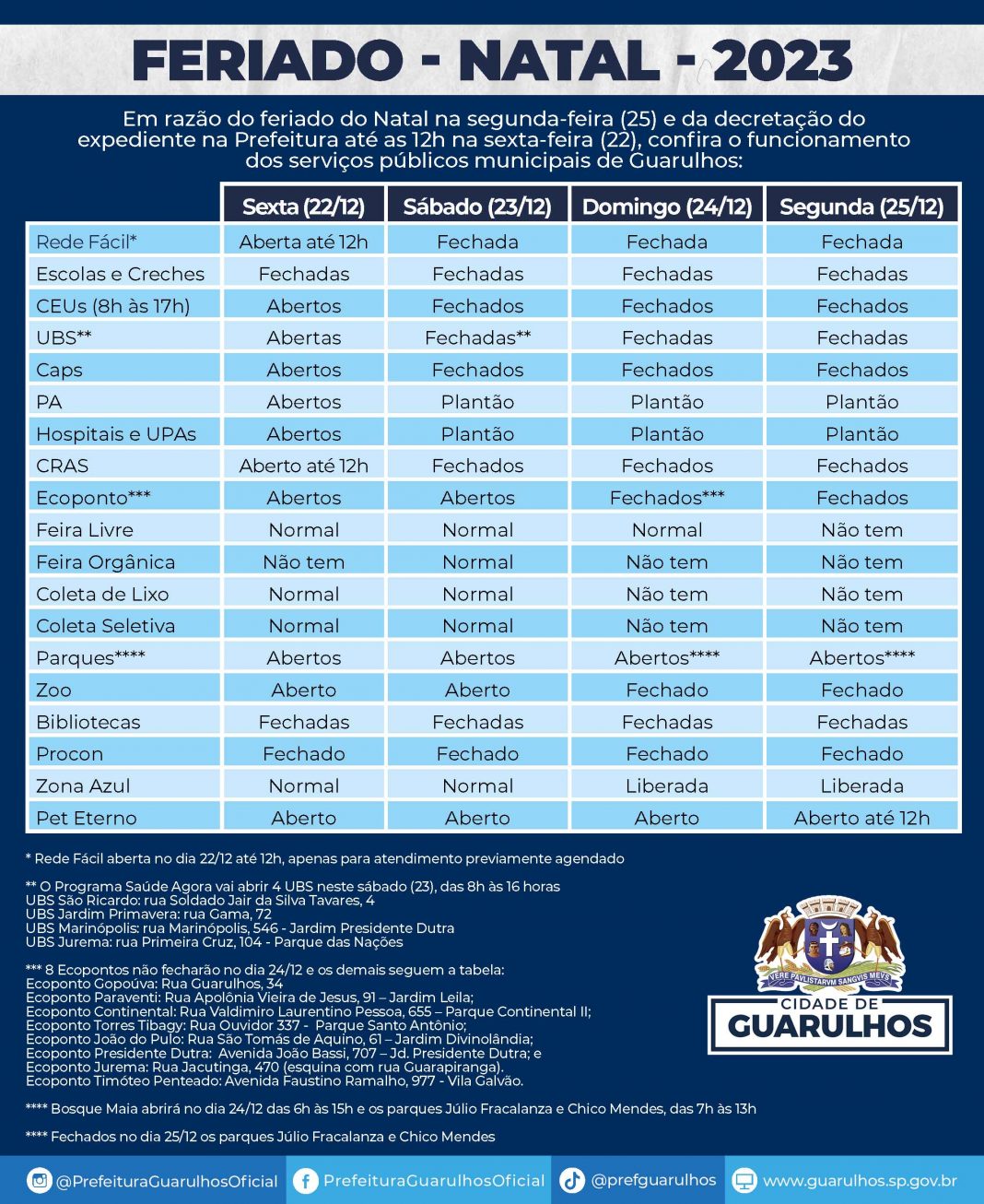 Prefeitura divulga o funcionamento dos serviços municipais no Natal dezembro 20, 2023 Atualizado: dezembro 20, 2023 Compartilhar WhatsAppFacebookTwitterLinkedin Em razão do feriado do Natal na segunda-feira (25) e da decretação do expediente na Prefeitura até as 12h na sexta-feira (22), confira o funcionamento dos serviços públicos municipais de Guarulhos. Veja abaixo Compartilhar WhatsAppFacebookTwitterLinkedin Em alta Destaque Saúde promove capacitação em segurança alimentar ao longo de 2026 fevereiro 10, 2026 Destaque CPTM e Metrô terão operação 24 horas para o Carnaval 2026 fevereiro 10, 2026 Política Diretor Jurídico do BRB deixa cargo após caso Banco Master fevereiro 10, 2026 Destaque Projeto Cidadania Itinerante leva serviços públicos ao Bosque Maia e ao CEU Pimentas fevereiro 10, 2026 Notícias relacionadas Destaque Saúde promove capacitação em segurança alimentar ao longo de 2026 fevereiro 10, 2026 Destaque CPTM e Metrô terão operação 24 horas para o Carnaval 2026 fevereiro 10, 2026 Política Diretor Jurídico do BRB deixa cargo após caso Banco Master fevereiro 10, 2026 Destaque Projeto Cidadania Itinerante leva serviços públicos ao Bosque Maia e ao CEU Pimentas fevereiro 10, 2026