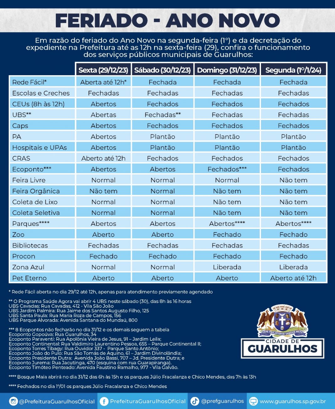 Prefeitura divulga como funcionará os serviços municipais no período do Ano Novo dezembro 27, 2023 Atualizado: dezembro 27, 2023 Compartilhar WhatsAppFacebookXLinkedin Em razão do feriado do Ano Novo na segunda-feira (1°) e do decreto que estabelece o expediente na Prefeitura até as 12h nesta sexta-feira (29), confira, em anexo, a tabela de funcionamento dos serviços públicos municipais de Guarulhos nesse período: Compartilhar WhatsAppFacebookXLinkedin Em alta Destaque Prefeitura de Guarulhos inicia implantação de nova gestão hospitalar no HMPB abril 1, 2026 Carros Haval H9 alcança liderança histórica ao superar Toyota SW4, e GWM bate novo recorde de vendas em março abril 1, 2026 Colunas “O autismo não tem cara”: Heitor Werneck denuncia psicofobia e capacitismo contra pessoas no espectro abril 1, 2026 Colunas Consórcio no IR: erros comuns podem levar à malha fina; veja como declarar corretamente abril 1, 2026 Notícias relacionadas Destaque Prefeitura de Guarulhos inicia implantação de nova gestão hospitalar no HMPB abril 1, 2026 Carros Haval H9 alcança liderança histórica ao superar Toyota SW4, e GWM bate novo recorde de vendas em março abril 1, 2026 Colunas “O autismo não tem cara”: Heitor Werneck denuncia psicofobia e capacitismo contra pessoas no espectro abril 1, 2026 Colunas Consórcio no IR: erros comuns podem levar à malha fina; veja como declarar corretamente abril 1, 2026
