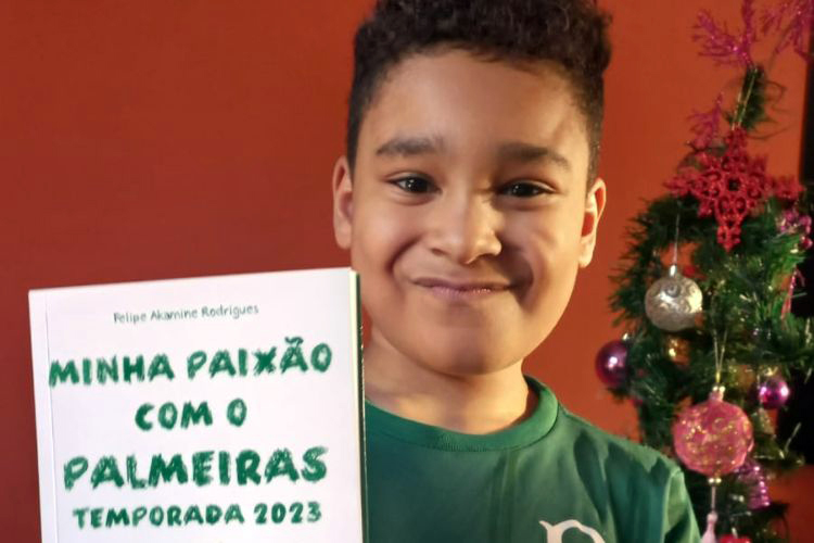 O jovem escritor guarulhense Felipe Akamine Rodrigues, o Lipe, de oito anos, aluno do 3º ano da EPG Profª Zulma Castanheira de Oliveira, no Parque Cecap, acaba de lançar Minha Paixão com o Palmeiras, livro no qual conta o ano futebolístico do Verdão, seu time do coração, e outros acontecimentos do esporte bretão em 2023.