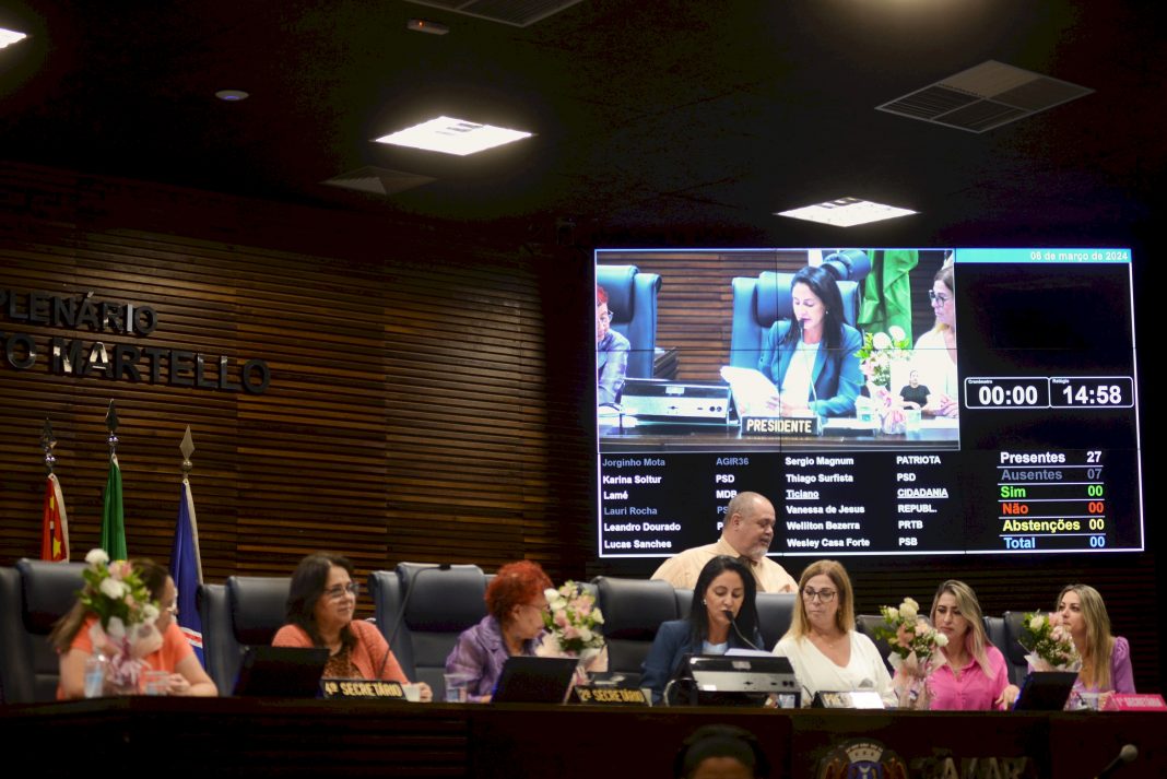 Em Sessão Ordinária realizada na tarde desta quarta-feira, 06/03, a Câmara de Guarulhos votou 13 itens, todos com prévio parecer das Comissões Técnicas Permanentes. O destaque foi a discussão de proposituras que remetem ao mês dedicado ao universo feminino. Para completar a iniciativa, o presidente Ticiano (Cidadania) cedeu a presidência para sua vice, Karina Soltur (PSD), assumir a presidência dos trabalhos.