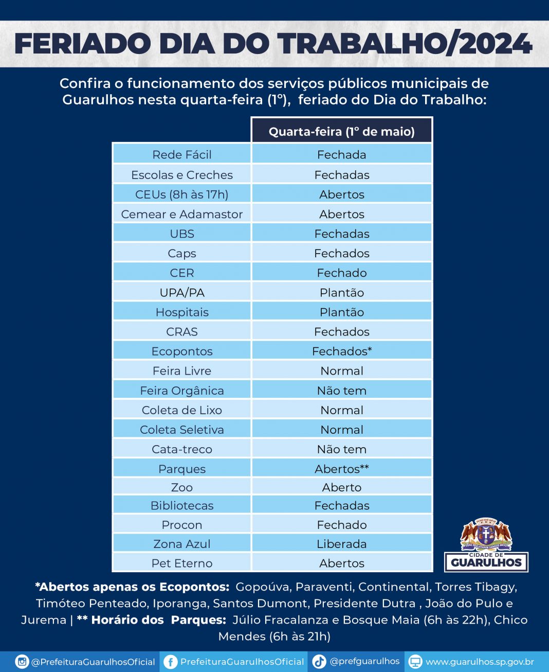 Prefeitura divulga o funcionamento dos serviços municipais no feriado de 1º de Maio abril 30, 2024 Atualizado: abril 30, 2024 Compartilhar WhatsAppFacebookXLinkedin Confira como será o esquema de funcionamento dos serviços públicos municipais de Guarulhos nesta quarta-feira (1º), feriado do Dia do Trabalho, na tabela, em anexo, e abaixo: Compartilhar WhatsAppFacebookXLinkedin Em alta Cidade Feriado de Tiradentes aumenta fluxo de passageiros em aeroportos abril 17, 2026 Destaque GCM intensifica combate ao tráfico e apreende drogas em operação abril 17, 2026 Esporte Copa Mundial de Futebol Unificado: Brasil cai no grupo dos anfitriões franceses abril 17, 2026 Colunas Supercarregadeira para terrenos inclinados é apresentada em Pernambuco abril 17, 2026 Notícias relacionadas Cidade Feriado de Tiradentes aumenta fluxo de passageiros em aeroportos abril 17, 2026 Destaque GCM intensifica combate ao tráfico e apreende drogas em operação abril 17, 2026 Esporte Copa Mundial de Futebol Unificado: Brasil cai no grupo dos anfitriões franceses abril 17, 2026 Colunas Supercarregadeira para terrenos inclinados é apresentada em Pernambuco abril 17, 2026