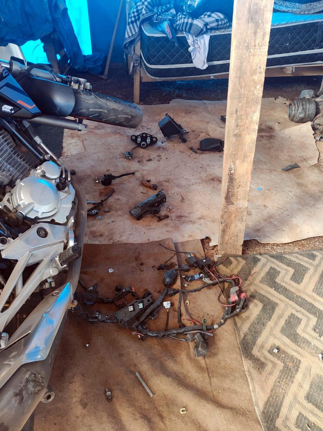 A Guarda Civil Municipal (GCM) de Guarulhos localizou na tarde de sábado (4) uma motocicleta Honda CB 250 F Twister, ano 2021, sem emplacamento, além de dez peças e partes diversas de outras motocicletas após receber uma denúncia de desmanche em um barraco na avenida Luiz Gonzaga do Nascimento, no Jardim Ponte Alta II.