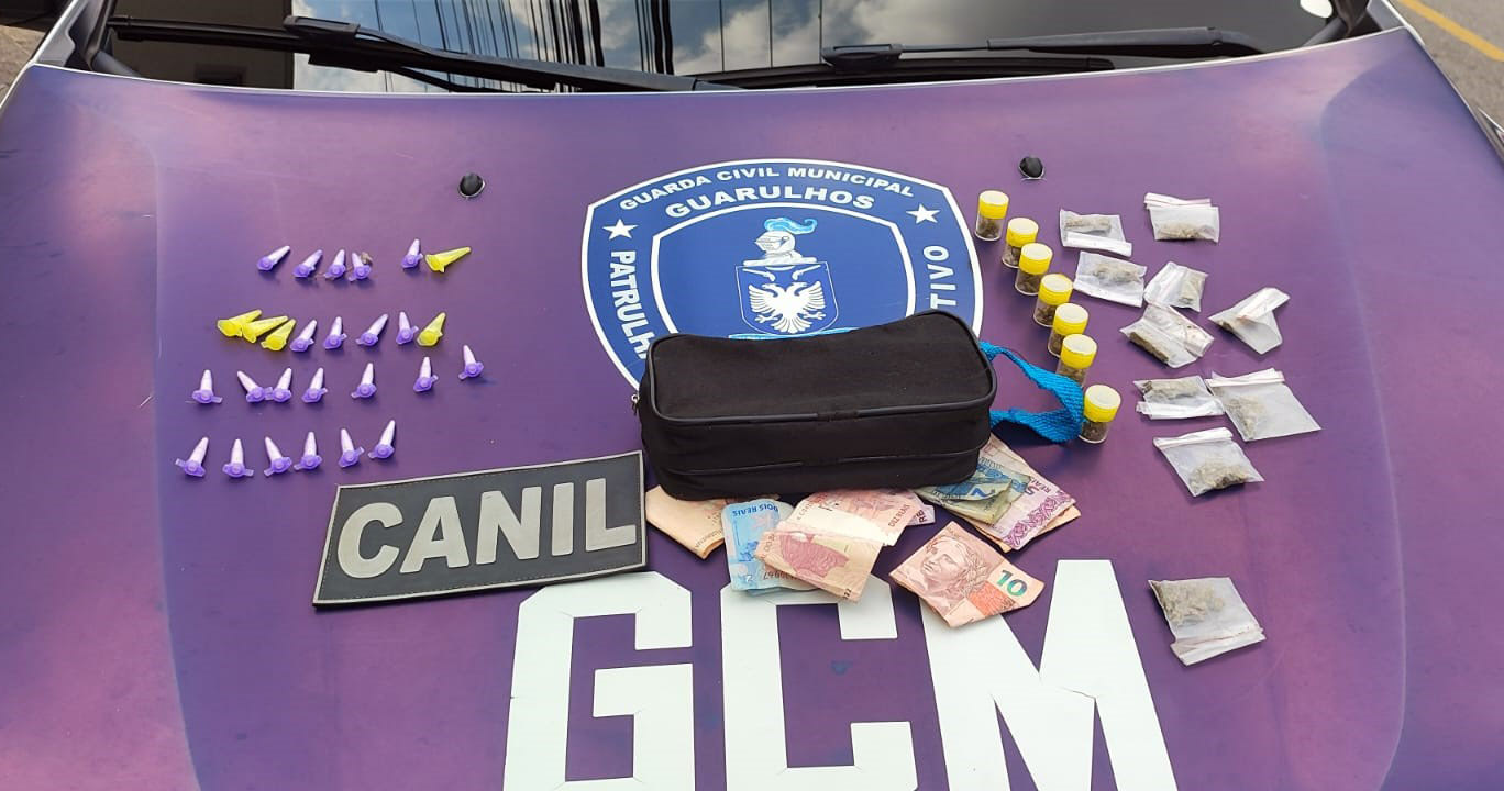 O Canil da Guarda Civil Municipal (GCM) de Guarulhos prendeu um homem nesta segunda-feira (20) por tráfico de entorpecentes na rua José Carrenho, no Jardim Gracinda, flagrado durante um patrulhamento preventivo da equipe. Com ele e em uma pochete escondida nas proximidades foram localizados dinheiro e drogas, sendo 27 embalagens com cocaína e 17 com maconha.