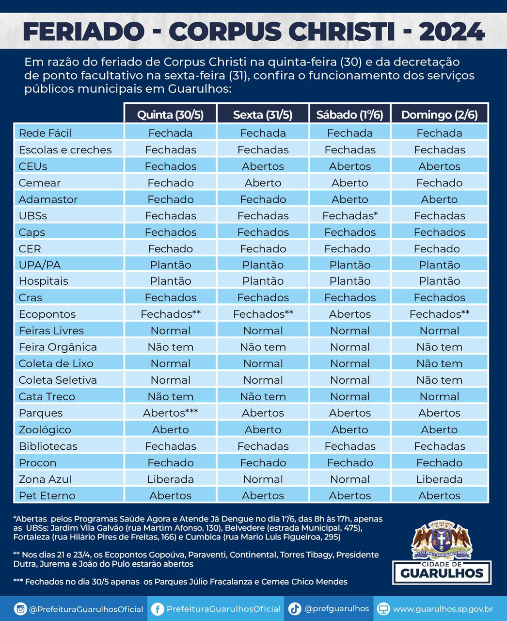 Prefeitura divulga como será o atendimento no feriado prolongado maio 28, 2024 Atualizado: maio 28, 2024 Compartilhar WhatsAppFacebookXLinkedin Em razão do feriado de Corpus Christi na quinta-feira (30) e do ponto facultativo na sexta-feira (31), os serviços públicos municipais funcionarão parcialmente, apenas os serviços essenciais não alterarão sua rotina. Veja a tabela abaixo e em anexo Compartilhar WhatsAppFacebookXLinkedin Em alta Esporte Botafogo oficializa contratação do técnico português Franclim Carvalho abril 2, 2026 Destaque Reconstrução dentária para mulheres vítimas de violência pode virar lei em Guarulhos abril 2, 2026 Destaque Vereadora intensifica ações após denúncias de violência obstétrica no Hospital JJM abril 2, 2026 Política Governo de SP publica edital para concessão de parques urbanos na capital abril 2, 2026 Notícias relacionadas Esporte Botafogo oficializa contratação do técnico português Franclim Carvalho abril 2, 2026 Destaque Reconstrução dentária para mulheres vítimas de violência pode virar lei em Guarulhos abril 2, 2026 Destaque Vereadora intensifica ações após denúncias de violência obstétrica no Hospital JJM abril 2, 2026 Política Governo de SP publica edital para concessão de parques urbanos na capital abril 2, 2026