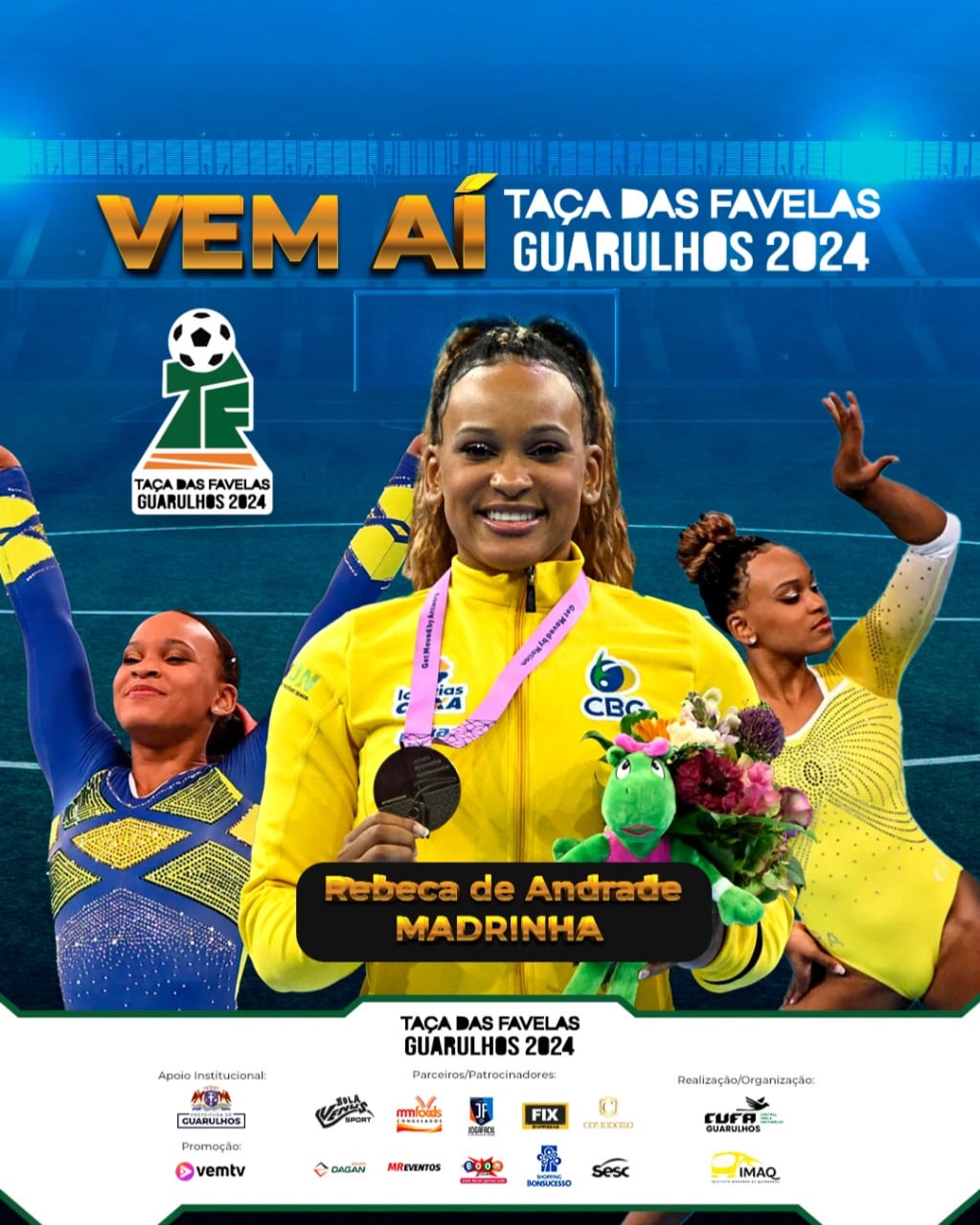 É com imenso orgulho que anunciamos a nossa madrinha para a Taça das Favelas Guarulhos: Rebeca Andrade! Um ícone da ginástica artística brasileira, Rebeca é a primeira medalhista olímpica feminina da ginástica do país, conquistando prata no individual geral e ouro no salto nos Jogos Olímpicos Tóquio 2020 .