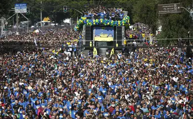 Acompanhado do apóstolo Estevam Hernandes, da Igreja Renascer em Cristo, o prefeito de São Paulo, Ricardo Nunes discursou de um carro de som. Dizendo estar feliz e emocionado, Nunes pediu orações pelas pessoas afetadas pela catástrofe climática no Rio Grande do Sul. “Que a gente possa colocar os nossos irmãos do Rio Grande do Sul em nossas orações, para que eles tenham de todos nós uma energia muito positiva”, conclamou o prefeito, que estava junto com a esposa, Regina.