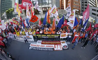 Centrais sindicais fizeram, nesta terça-feira (18), um ato pedindo a queda da taxa básica de juros (Selic), na Avenida Paulista, região central da capital. Com bandeiras e carros de som, o grupo se reuniu em frente ao prédio do Banco Central (BC). O presidente da autoridade monetária, Campos Neto, também foi criticado durante o protesto.