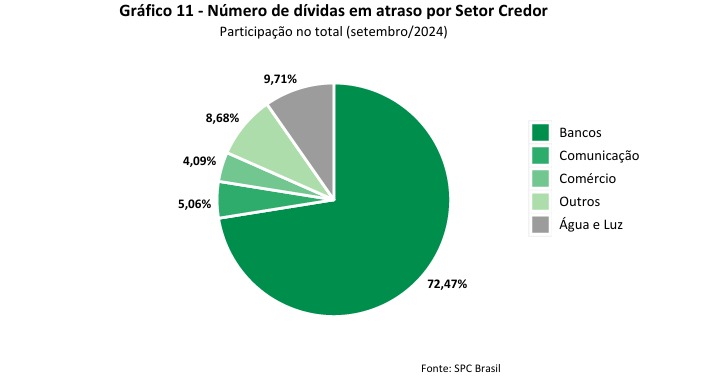 O setor com participação mais expressiva do número de dívidas em setembro no estado de São Paulo foi Bancos, com 72,47% do total de dívidas.