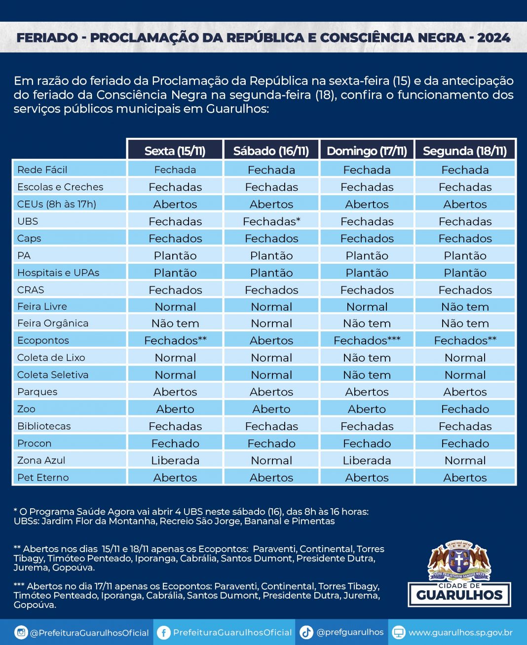 Feriados alteram funcionamento dos serviços públicos municipais de sexta-feira a segunda-feira novembro 13, 2024 Atualizado: novembro 13, 2024 Compartilhar WhatsAppFacebookXLinkedin Em razão do feriado da Proclamação da República na sexta-feira (15) e da antecipação do feriado da Consciência Negra na segunda-feira (18), confira, abaixo e no anexo, o funcionamento dos serviços públicos municipais em Guarulhos: Compartilhar WhatsAppFacebookXLinkedin Em alta brasil Anvisa discute norma para manipulação de canetas emagrecedoras abril 18, 2026 Destaque Combate a fraudes recuperou volume de água suficiente para abastecer uma cidade como Guarulhos por 30 dias abril 18, 2026 Destaque Governo de SP reforça vacinação contra a gripe com chegada do outono e convoca público prioritário abril 18, 2026 Esporte Marcelo Casanova se consolida como o principal representante do Brasil na categoria -95kg do paralímpico abril 18, 2026 Notícias relacionadas brasil Anvisa discute norma para manipulação de canetas emagrecedoras abril 18, 2026 Destaque Combate a fraudes recuperou volume de água suficiente para abastecer uma cidade como Guarulhos por 30 dias abril 18, 2026 Destaque Governo de SP reforça vacinação contra a gripe com chegada do outono e convoca público prioritário abril 18, 2026 Esporte Marcelo Casanova se consolida como o principal representante do Brasil na categoria -95kg do paralímpico abril 18, 2026