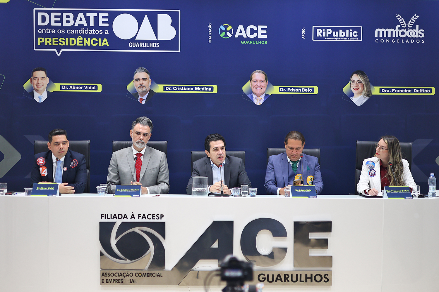 A Associação Comercial e Empresarial de Guarulhos organizou e sediou na noite de quinta-feira, 14/11, o debate entre os candidatos a presidente da OAB Guarulhos. O encontro foi transmitido ao vivo, nas redes sociais da ACE. Participaram do encontro os advogados: Dr. Cristiano Medina (Chapa 1 – União e Valorização da Advocacia), Dr. Abner Vidal (Chapa 2 – OAB Sempre em Frente – Evolução), Dra. Francine Delfino (Chapa 3 – Todos Pela Ordem – Transparência, União, Inclusão) e Dr. Edson Belo (Chapa 4 – Amor pela Advocacia).