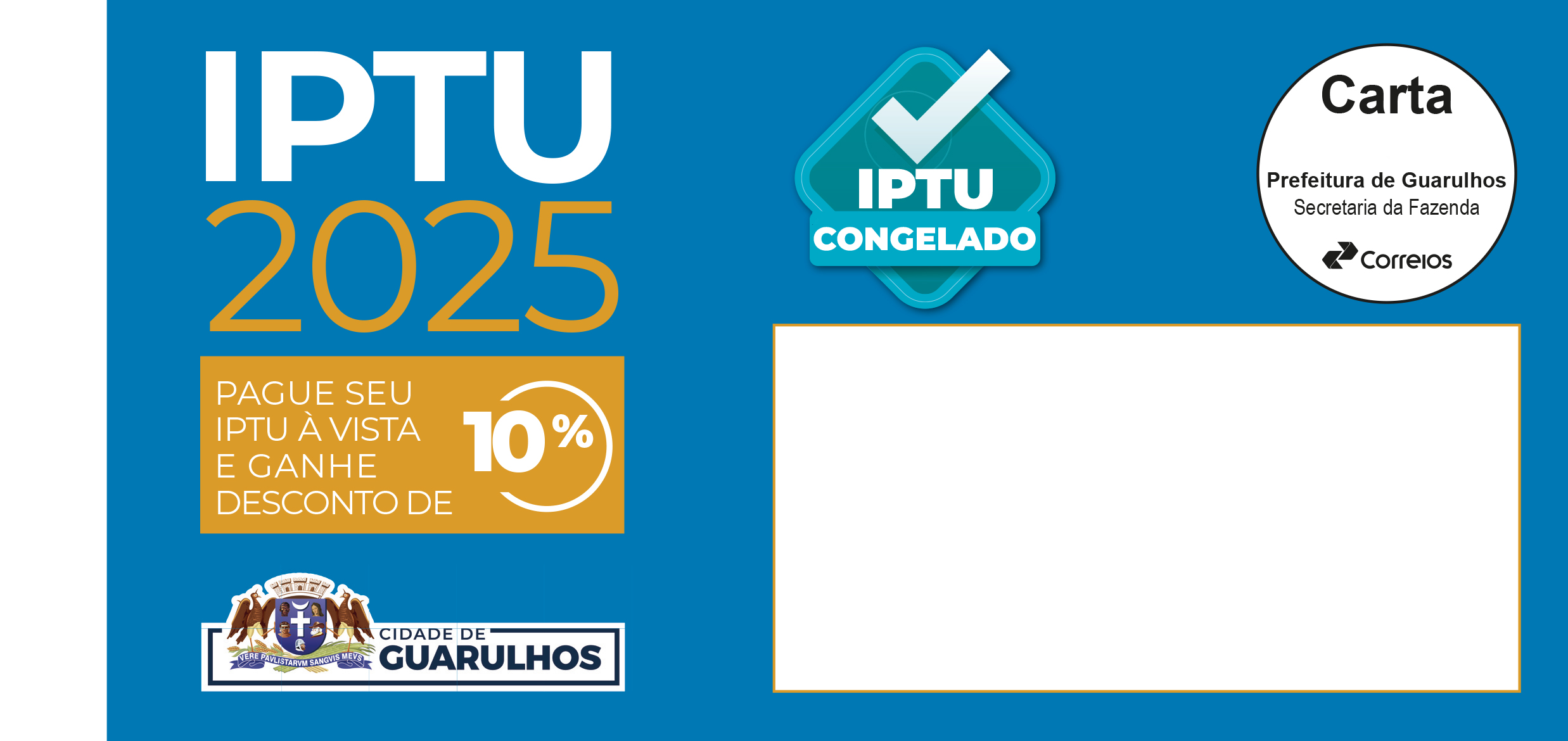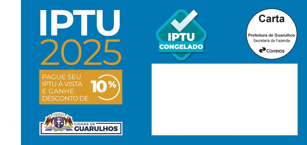 Os carnês do Imposto Predial e Territorial Urbano (IPTU) congelado em Guarulhos já começaram a ser entregues nesta semana nas cerca de 355 mil residências da cidade aptas a recebê-los. Os vencimentos da primeira parcela e da parcela única com 10% de desconto foram prorrogados para o dia 7 de fevereiro, conforme decreto publicado na sexta-feira (17) no Diário Oficial (https://diariooficial.guarulhos.sp.gov.br/uploads/pdf/286716694.pdf)