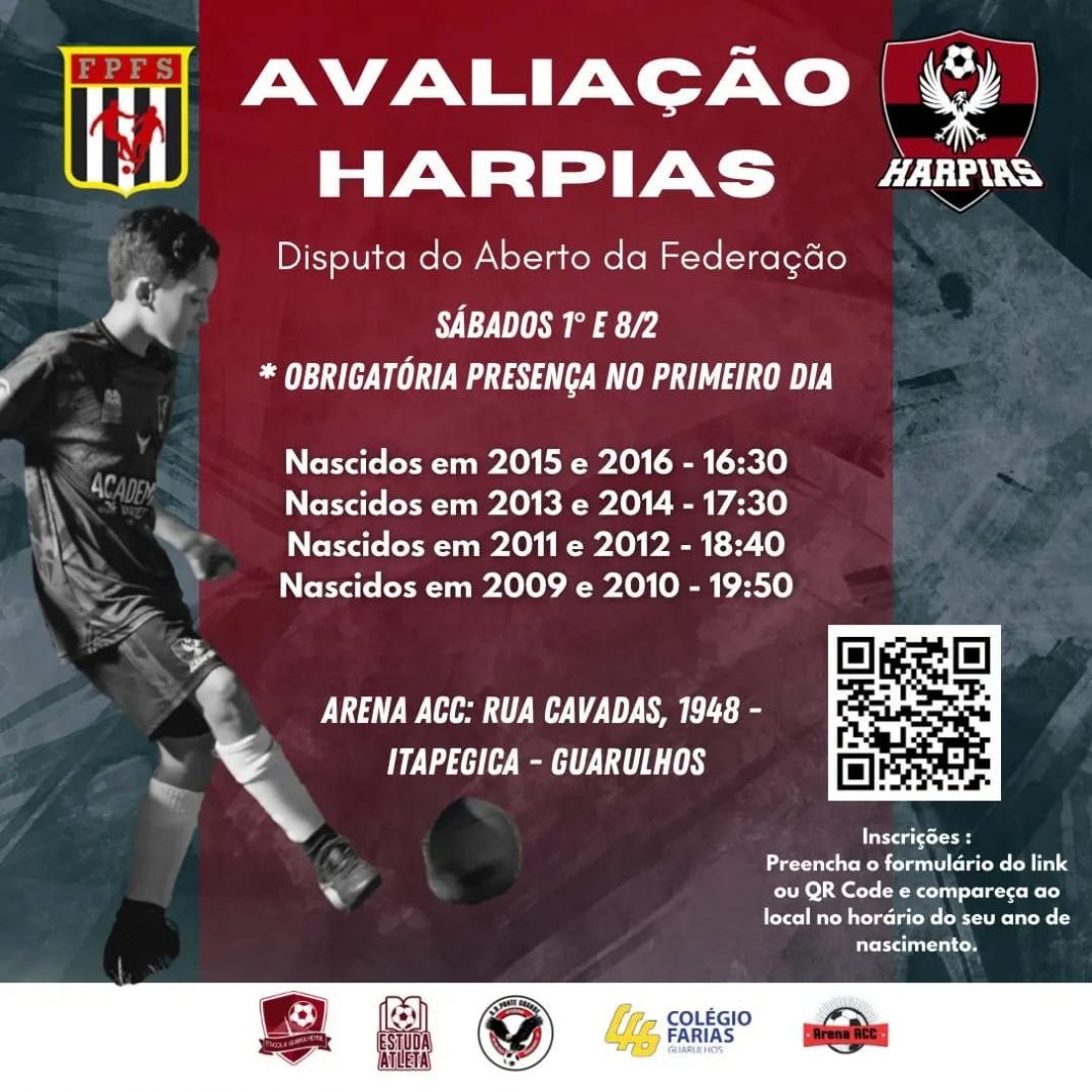 O Harpias, time que atende cerca de 200 atletas nas Unidades Ponte Grande e Gopoúva, abriu avaliações para a disputa do Aberto, torneio organizado pela Federação Paulista de Futsal. Os testes acontecerão nos sábados, dias 1º e 8 de fevereiro, no bairro do Itapegica.