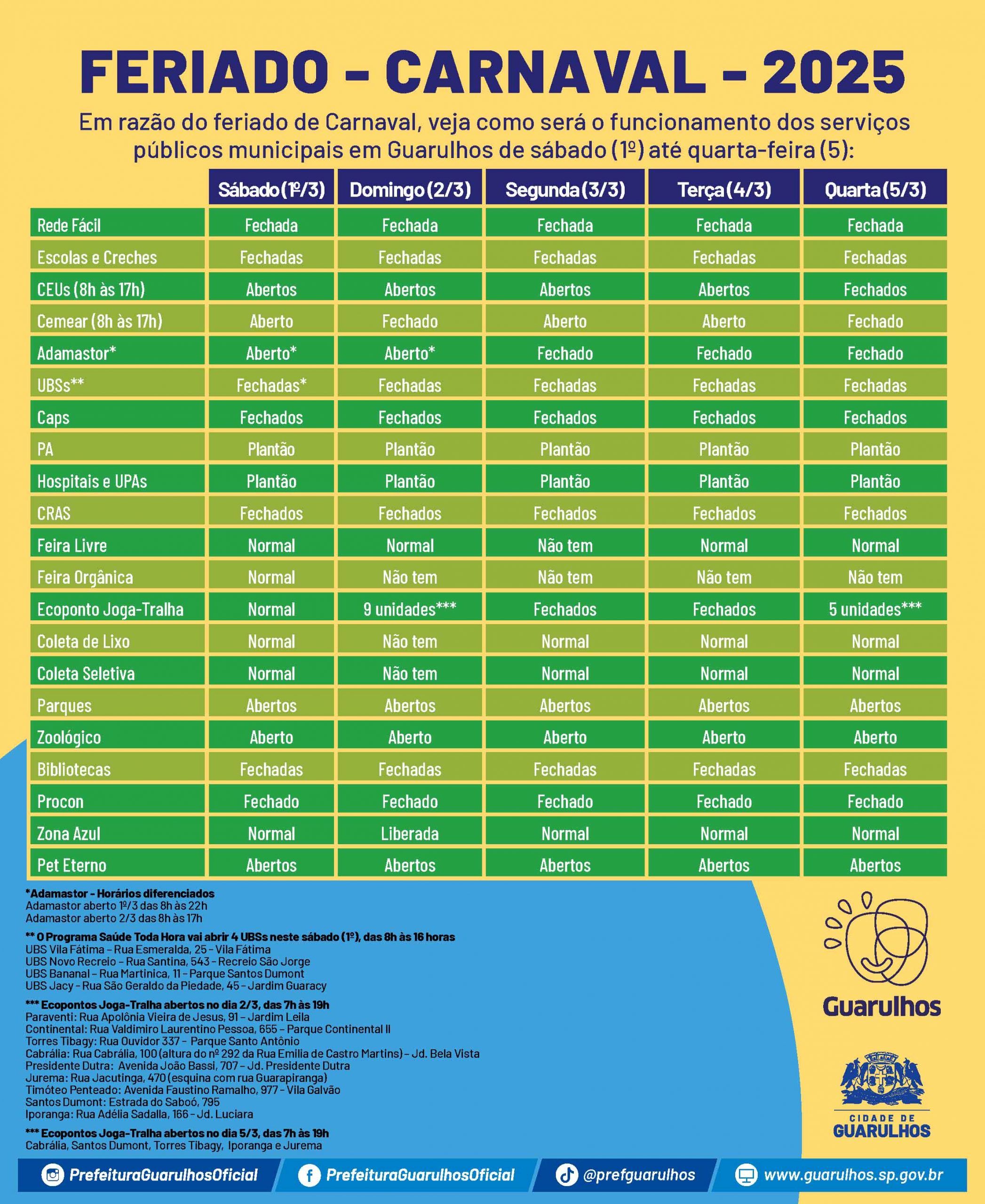 Em razão do feriado de Carnaval, do sábado (1º) até quarta-feira (5) não haverá expediente na Prefeitura de Guarulhos. A fim de orientar a população, a administração municipal informa como será o funcionamento dos serviços municipais nesse período. Veja a tabela em anexo e abaixo.
