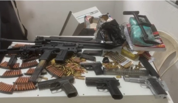 Na chegada da polícia, o detido foi flagrado portando uma pistola. No imóvel ao lado, foram encontradas porções de skunk e alguns armamentos, como quatro pistolas, uma carabina, uma submetralhadora e uma espingarda. Munições de fuzil e de diversos calibres também foram apreendidas.