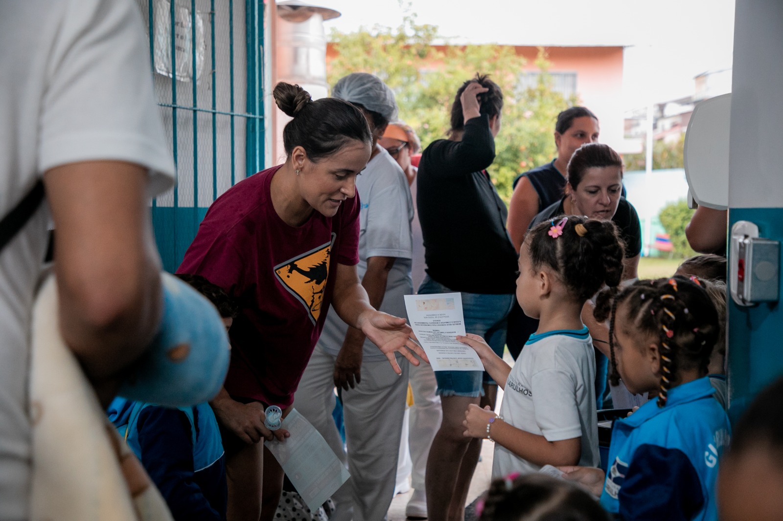 A chuva que caiu na última quinta-feira (3) não impediu que as crianças brigadistas do Núcleo Assistencial Anália Franco II, no Jardim City, também realizassem ação de entrega de cartazes para os pais e responsáveis no portão de entrada da unidade.