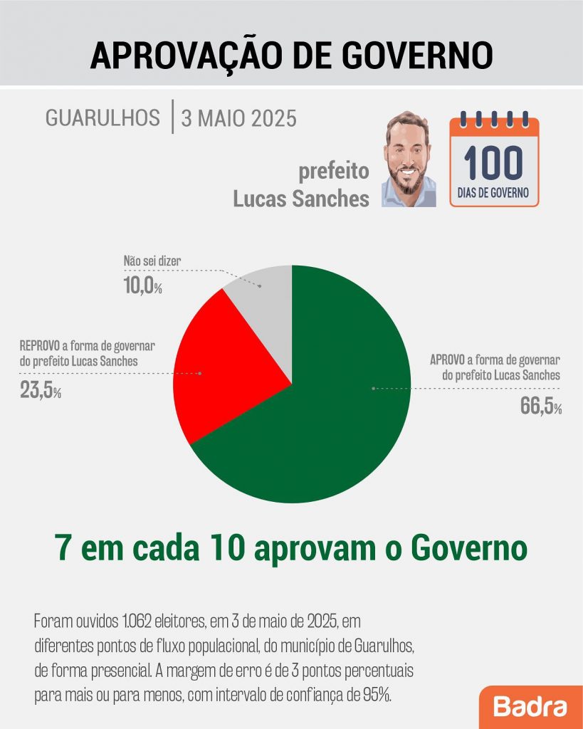 Pesquisa realizada pelo instituto de pesquisa Brada em 3 de maio de 2025 com 1062 eleitores, aprovam a administração do Prefeito Lucas Sanches. Foram ouvidas em vários pontos de fluxo presencial no municipio de Guarulhos. A margem de erros é de 3 pontos percentuais para mais ou para menos com intervalo de confiança de 95%.