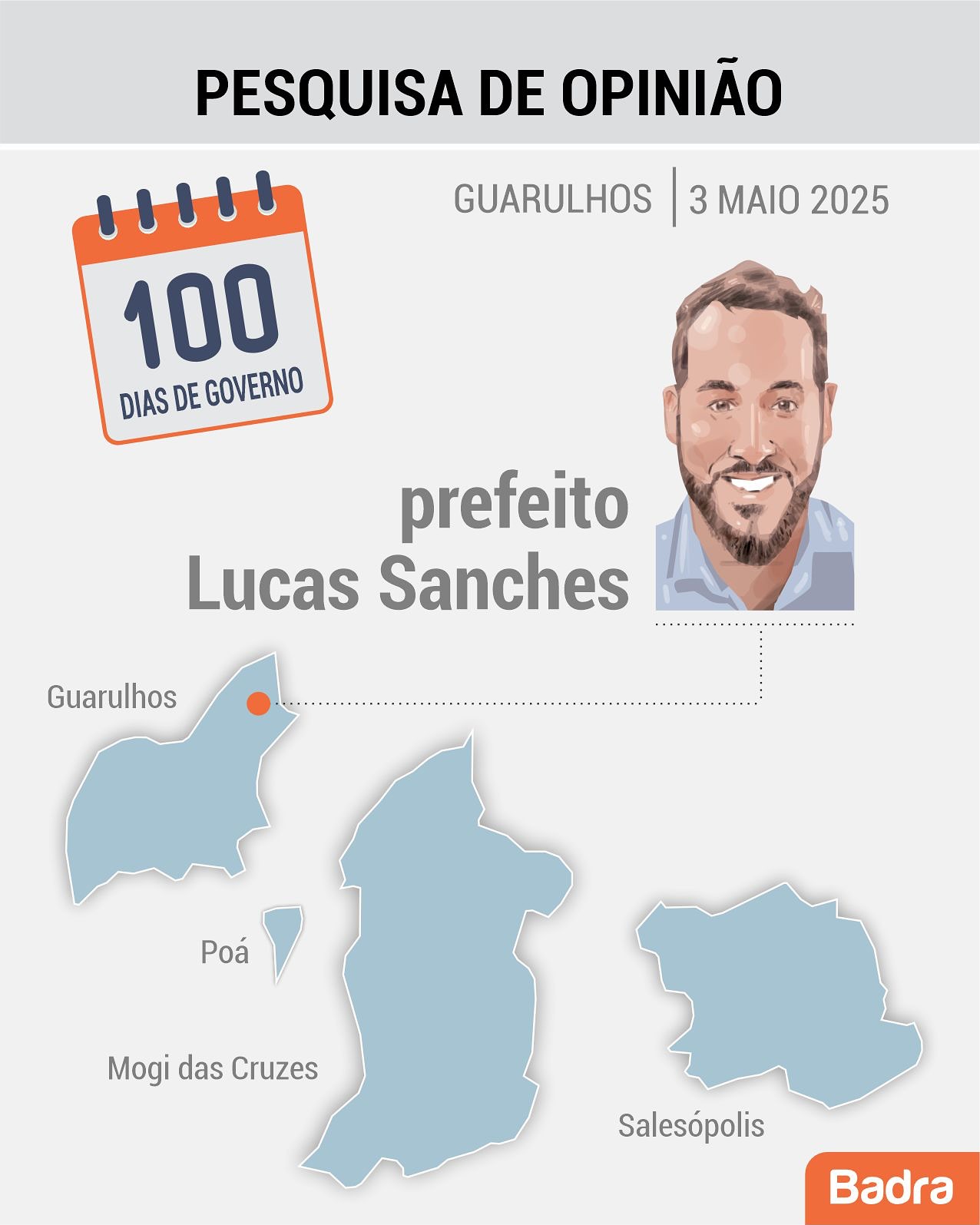 Pesquisa realizada pelo instituto de pesquisa Brada em 3 de maio de 2025 com 1062 eleitores, aprovam a administração do Prefeito Lucas Sanches. Foram ouvidas em vários pontos de fluxo presencial no municipio de Guarulhos. A margem de erros é de 3 pontos percentuais para mais ou para menos com intervalo de confiança de 95%.