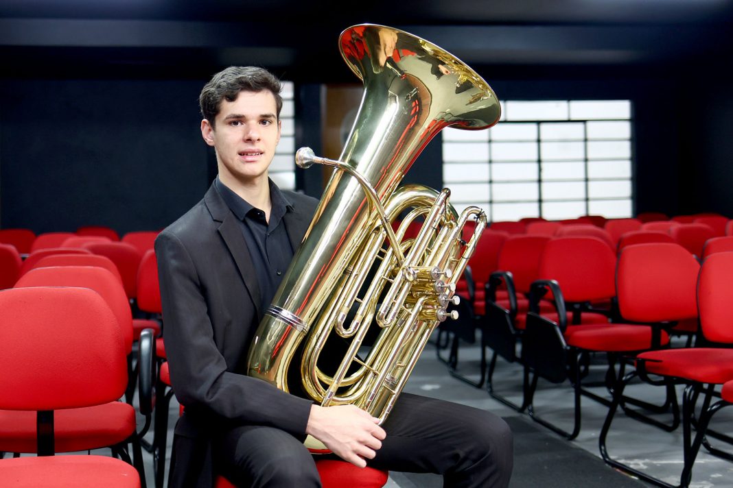 Estudante do Conservatório Municipal desde 2023, a ligação com a música nasceu bem antes, na infância, quando Gustavo assistia o pai figurar entre os músicos da Igreja Congregação Cristã no Brasil. “Eu cresci no meio dos músicos. Meu pai tocava eufônio, que fica muito próximo às tubas. Ali começou o meu interesse e, apesar de muito pequeno, com oito anos eu comecei a aprender eufônio e logo entrei na orquestra da igreja”, conta. Quatro anos depois, o pequeno Gustavo trocou o eufônio pela tuba e, além dos ensaios e apresentações na instituição religiosa, começou a se dedicar aos estudos caseiros com muito mais afinco. Anos depois, iniciaria sua trajetória nos estudos profissionais.