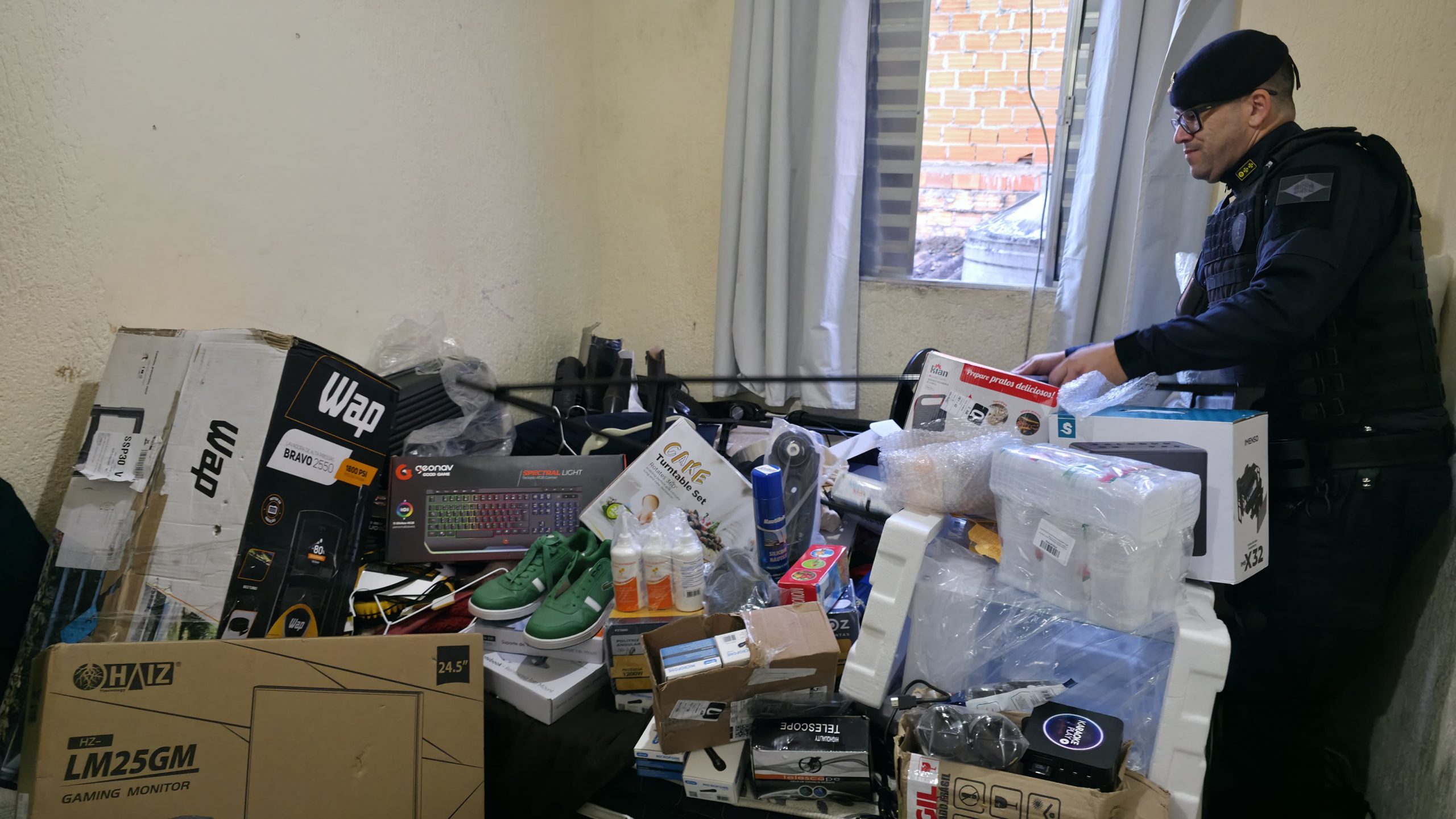 Durante a vistoria no imóvel, os agentes localizaram grande quantidade de objetos roubados, muitos deles acondicionados em sacos plásticos típicos de encomendas da empresa Mercado Livre, com etiquetas de endereços diversos. Também foram encontradas embalagens de outras transportadoras, algumas rasgadas, com destinatários distintos.