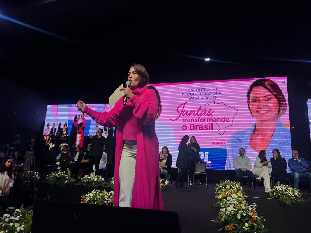 Em repouso por ordem médica por um mês em razão de uma esofagite, Bolsonaro participou do encontro abrigado neste sábado, no Espaço Inter, por chamada de vídeo. Ao som do coro “volta, Bolsonaro” e “mito”, o hoje presidente de Honra do PL saudou o público e elogiou Rosana e Michelle pelo trabalho empreendido pelo Brasil e no estado paulista em prol do movimento feminino da sigla:
