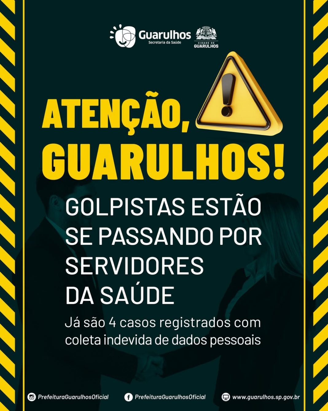 A Prefeitura de Guarulhos alerta a população sobre a atuação de golpistas que estão se passando por servidores da saúde para obter dados pessoais de moradores. Nos últimos dias, houve quatro casos em que indivíduos se apresentaram como representantes da pasta ou da Ouvidoria da Saúde e abordaram usuários em suas residências. Durante essas visitas, os falsos agentes chegaram a tirar fotos de documentos pessoais e do rosto dos pacientes, sem qualquer autorização oficial.