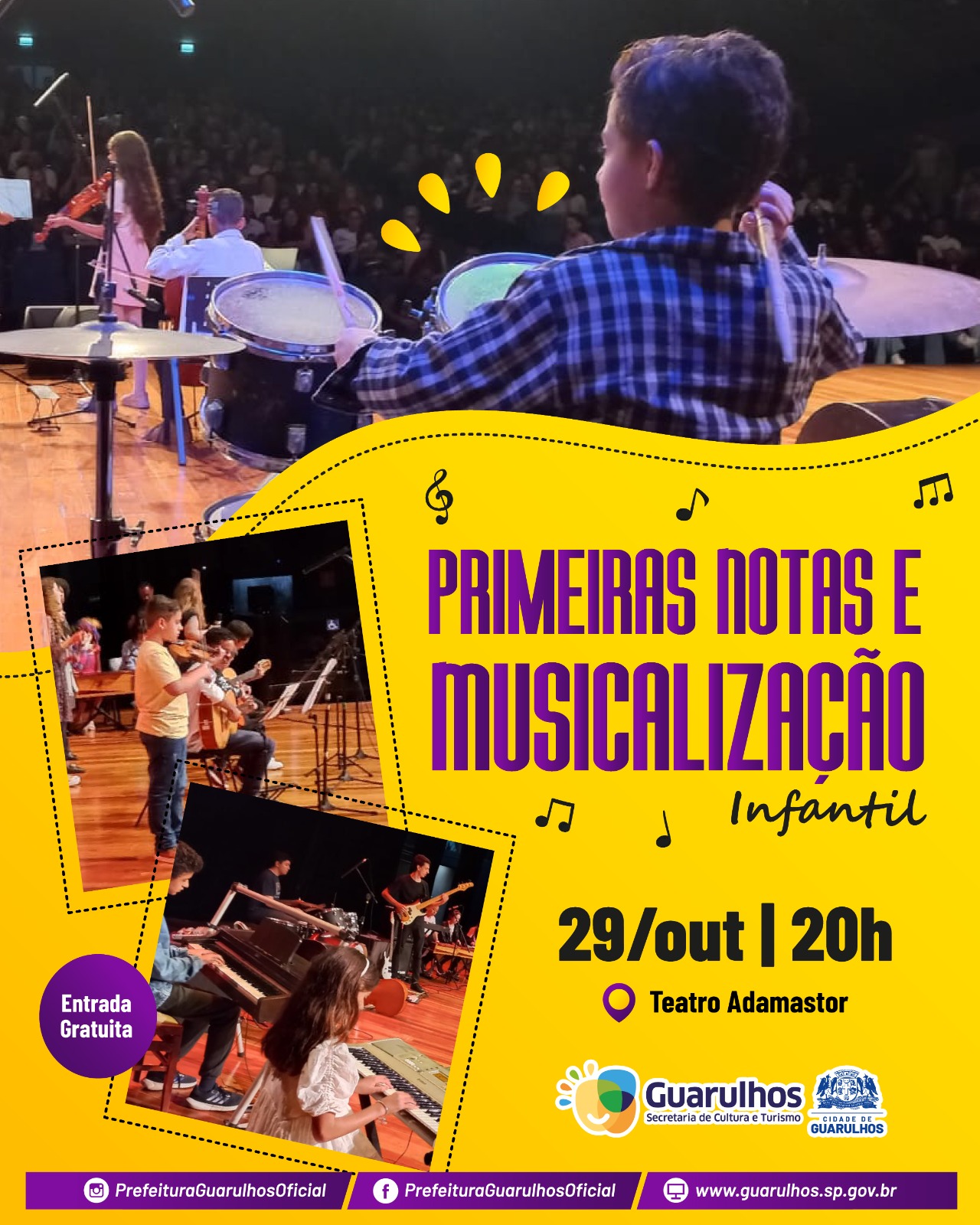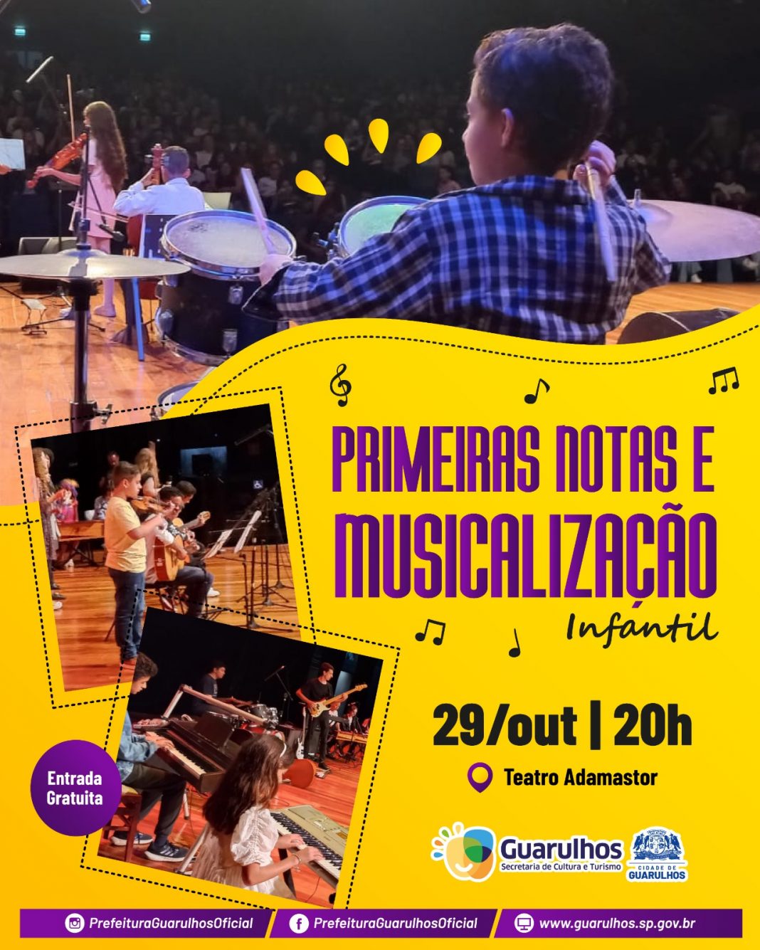 O palco do Teatro Adamastor receberá no próximo dia 29, a apresentação musical dos projetos Primeiras Notas e Musicalização Infantil, ambos formados por alunos dos cursos do Conservatório Municipal de Artes de Guarulhos. O espetáculo, que terá início às 20h, tem entrada gratuita e os ingressos serão distribuídos 30 minutos antes do início da apresentação.