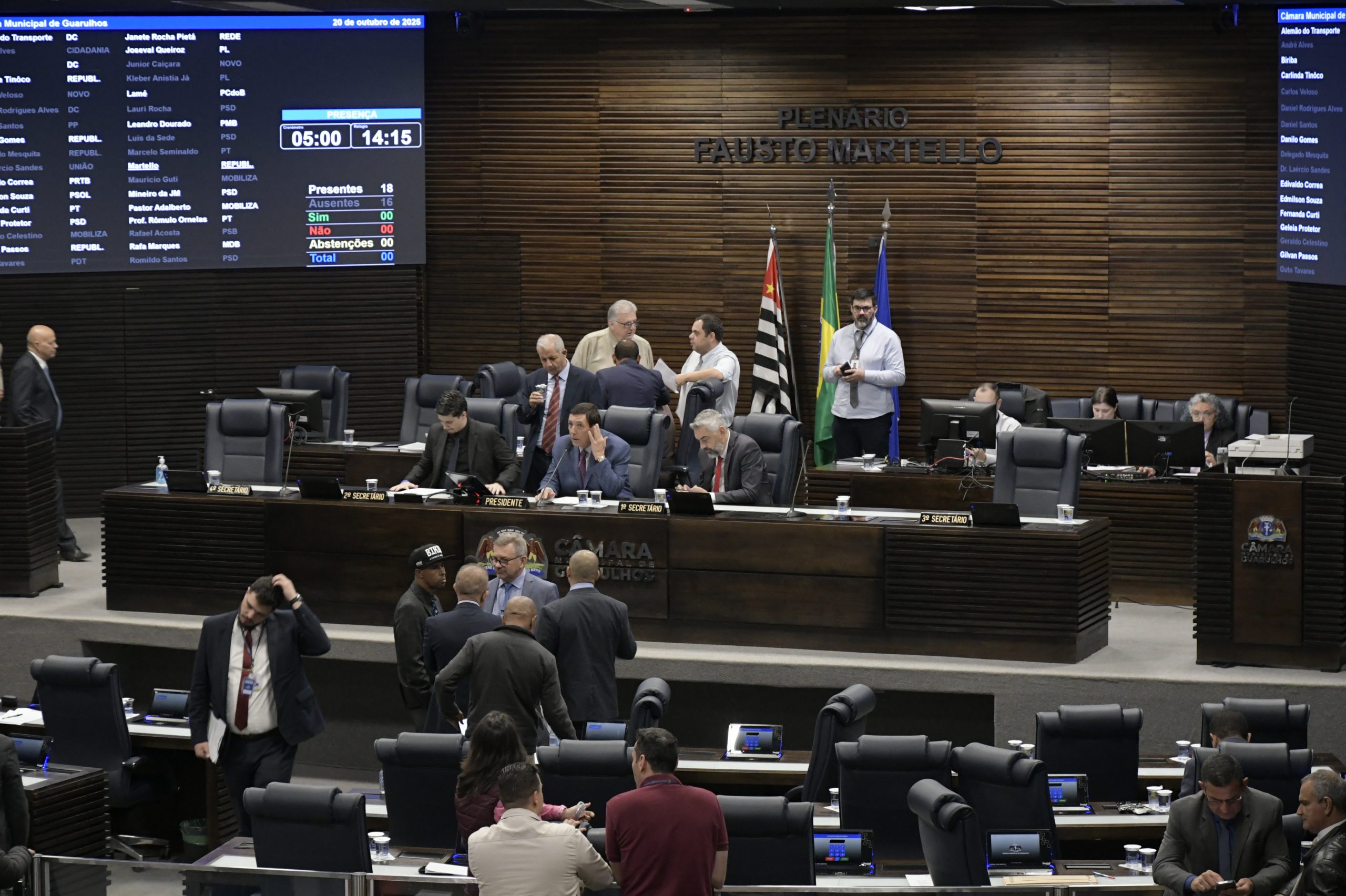 Os vereadores da Câmara de Guarulhos discutem e votam oito projetos em Sessão Ordinária programada para a tarde desta quarta-feira (22/10). Todas as proposituras estão em segundo turno de votação, ou seja, se aprovadas, seguem para sanção do Executivo. É o caso, por exemplo, de dois projetos de lei da Prefeitura: PL 422/2025, que altera a Lei 7306/2014, sobre a concessão de incentivos fiscais e tributários para empresas instaladas ou instalando-se no Município, e PL 421/2025, que altera as Leis 7397/2015 (denominação de próprios públicos vinculados à Política Municipal para as Mulheres) e 8361/2025 (nomenclatura de unidades de execução afetas à Subsecretaria de Política para as Mulheres).