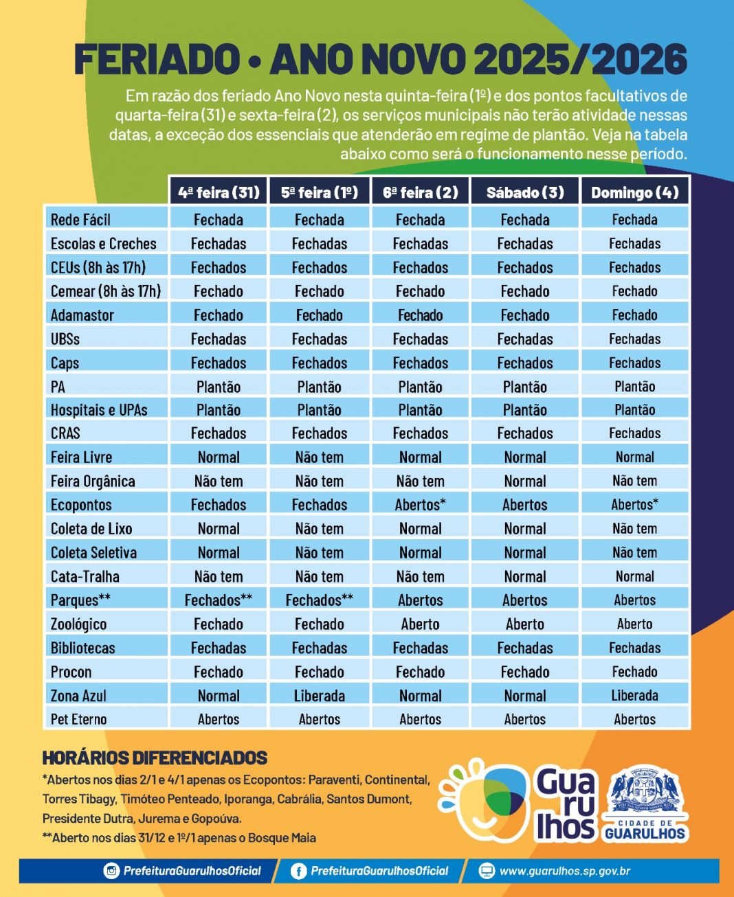 Em razão do feriado de Ano Novo nesta quinta-feira (1º) e dos pontos facultativos de quarta-feira (31) e sexta-feira (2), os serviços municipais não terão atividade nessas datas, a exceção dos serviços essenciais que atenderão em regime de plantão. Veja na tabela acima como será o funcionamento nesse período.