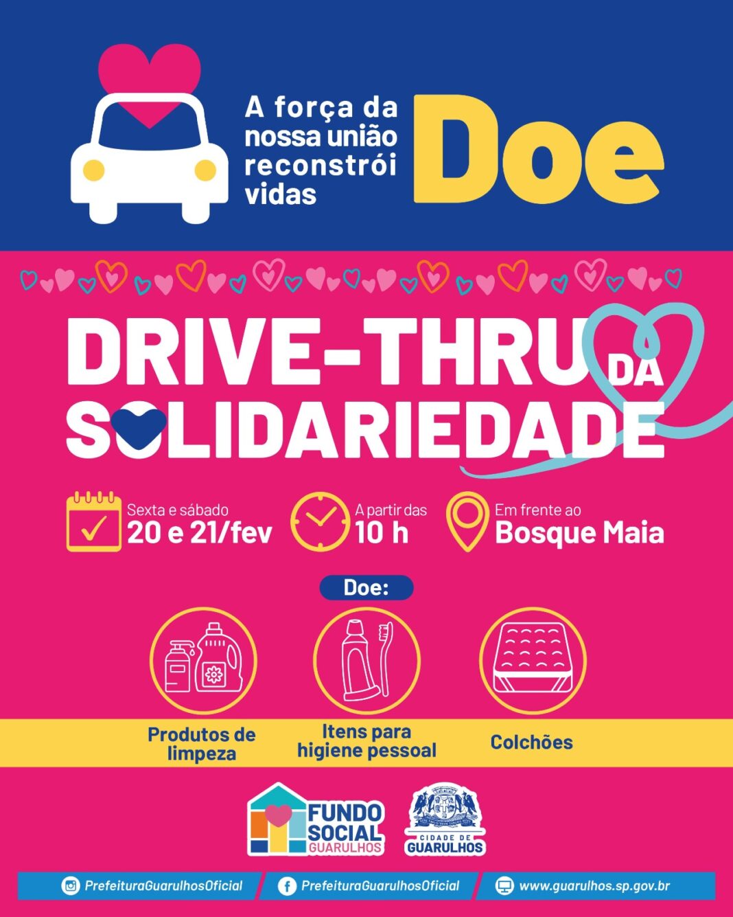 O Fundo Social de Solidariedade e a Prefeitura de Guarulhos irão realizar nesta sexta-feira (20), em frente ao Bosque Maia, a nova edição do Drive-Thru da Solidariedade, campanha para arrecadar doações às vítimas das chuvas que atingiram o município no início deste ano.