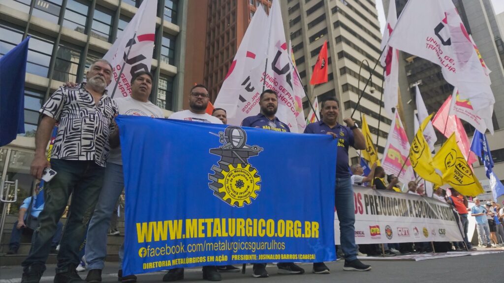 Uma delegação do Sindicato dos Metalúrgicos de Guarulhos e Região participou, terça (17), do protesto “Menos juros, mais empregos”, realizado em frente ao Banco Central, na Avenida Paulista, em São Paulo. A manifestação foi convocada pelas centrais sindicais Força Sindical, CUT, UGT, CTB, CSB e Nova Central Sindical de Trabalhadores.